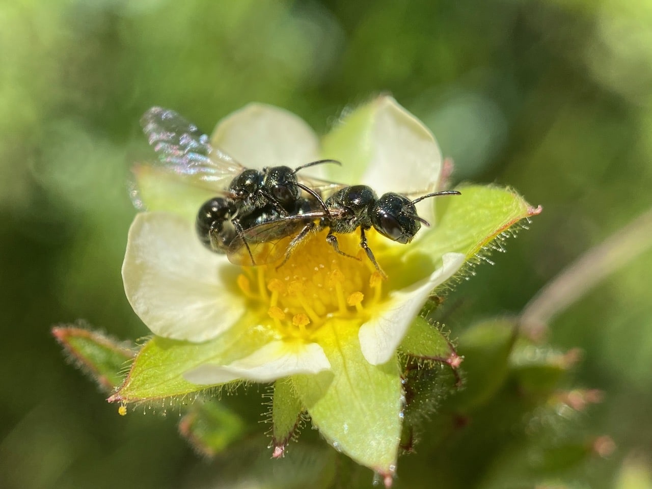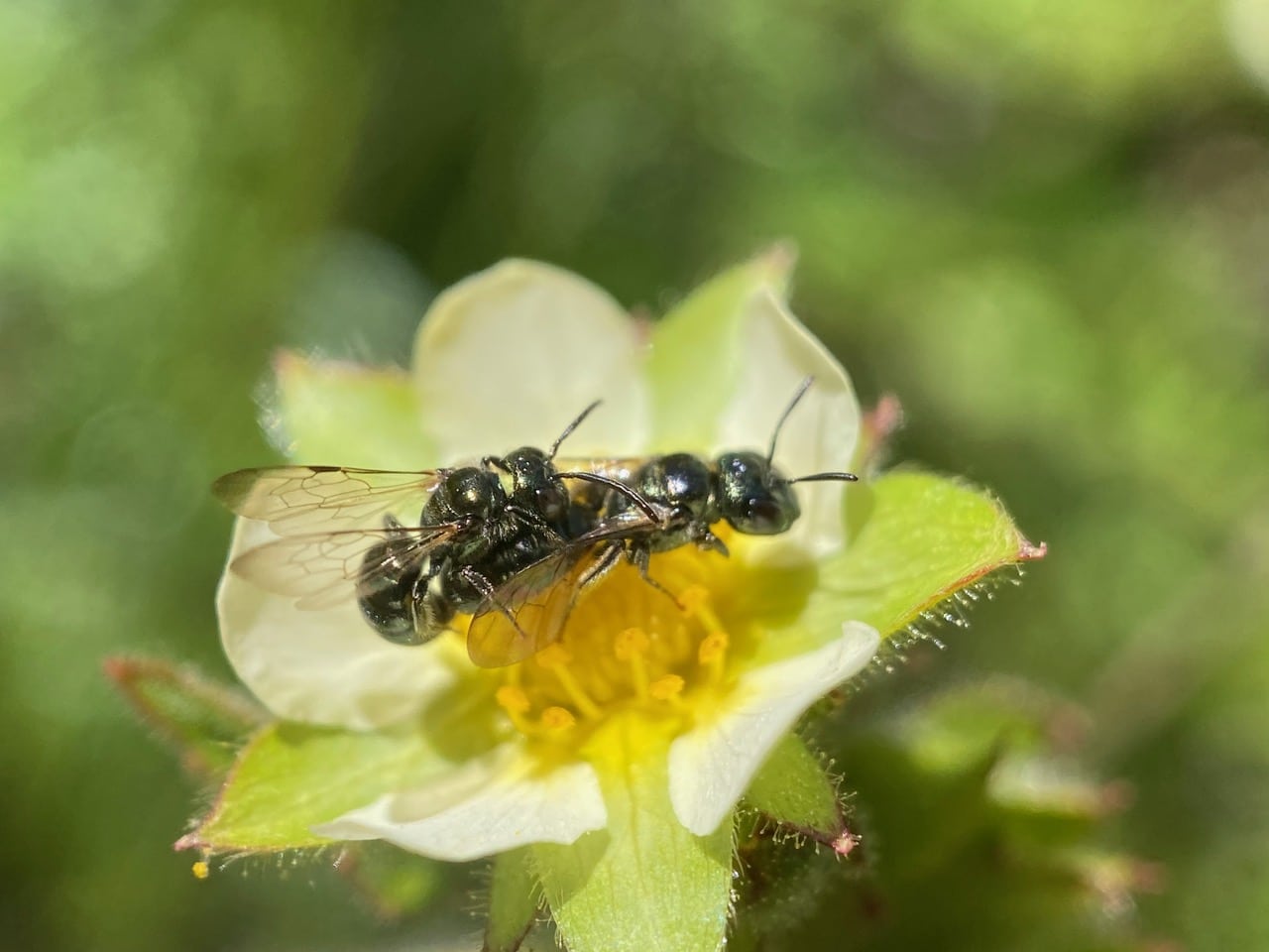 What I thought was a big insect on a Sticky Cinquefoil flower turns out to be a pair of Small Carpenter Bees mating!