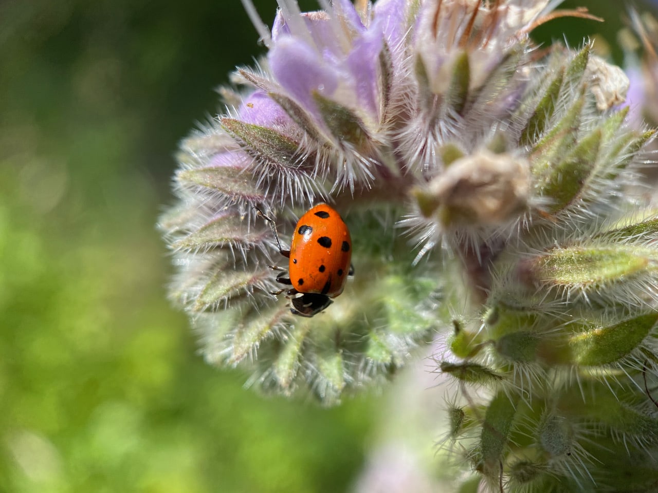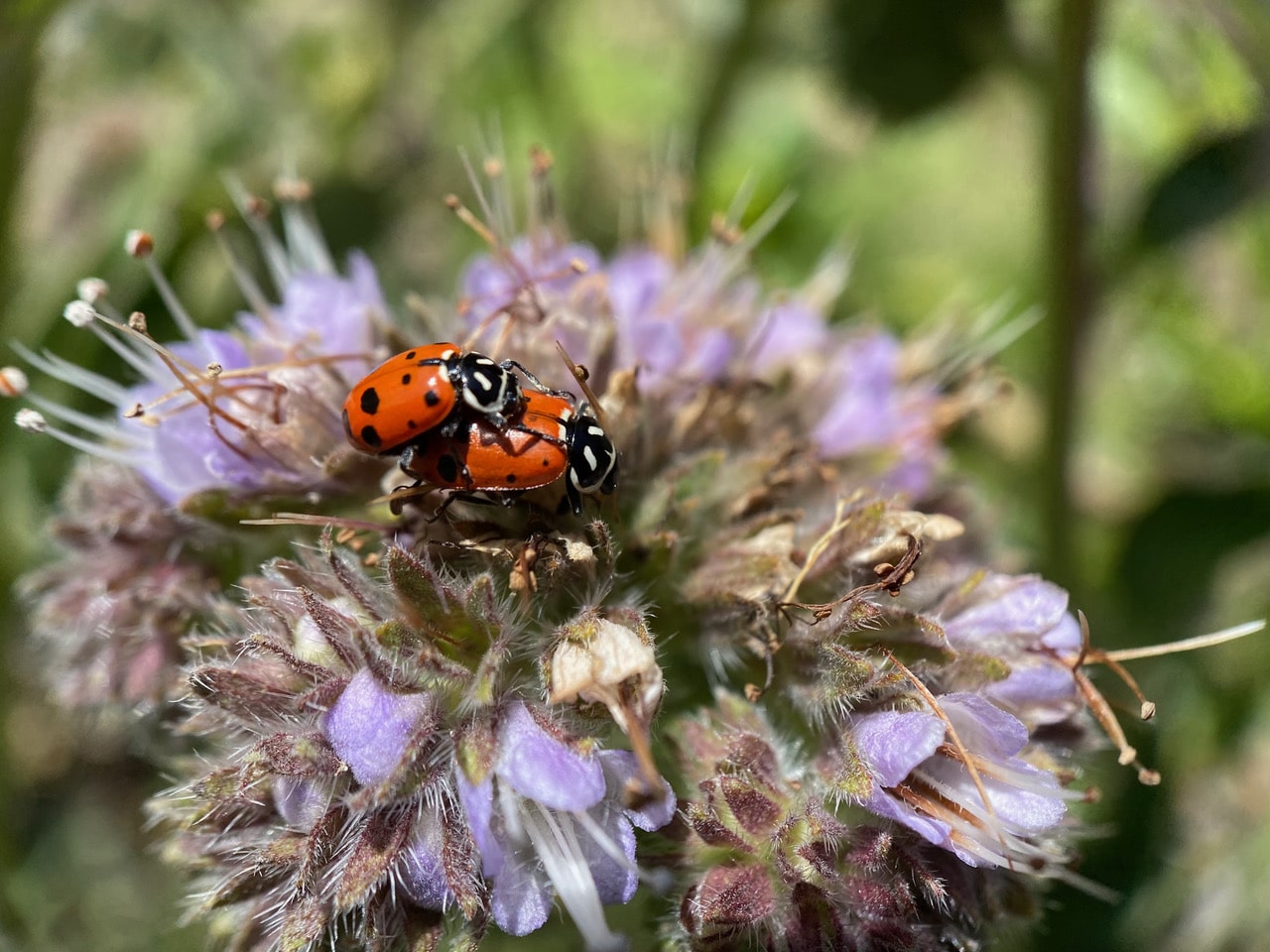 Ahh, something that’s instantly recognizable! A pair of Convergent Ladybeetles, Hippodamia convergens (family Coccinellidae) is mating on top of a phacelia inflorescence.