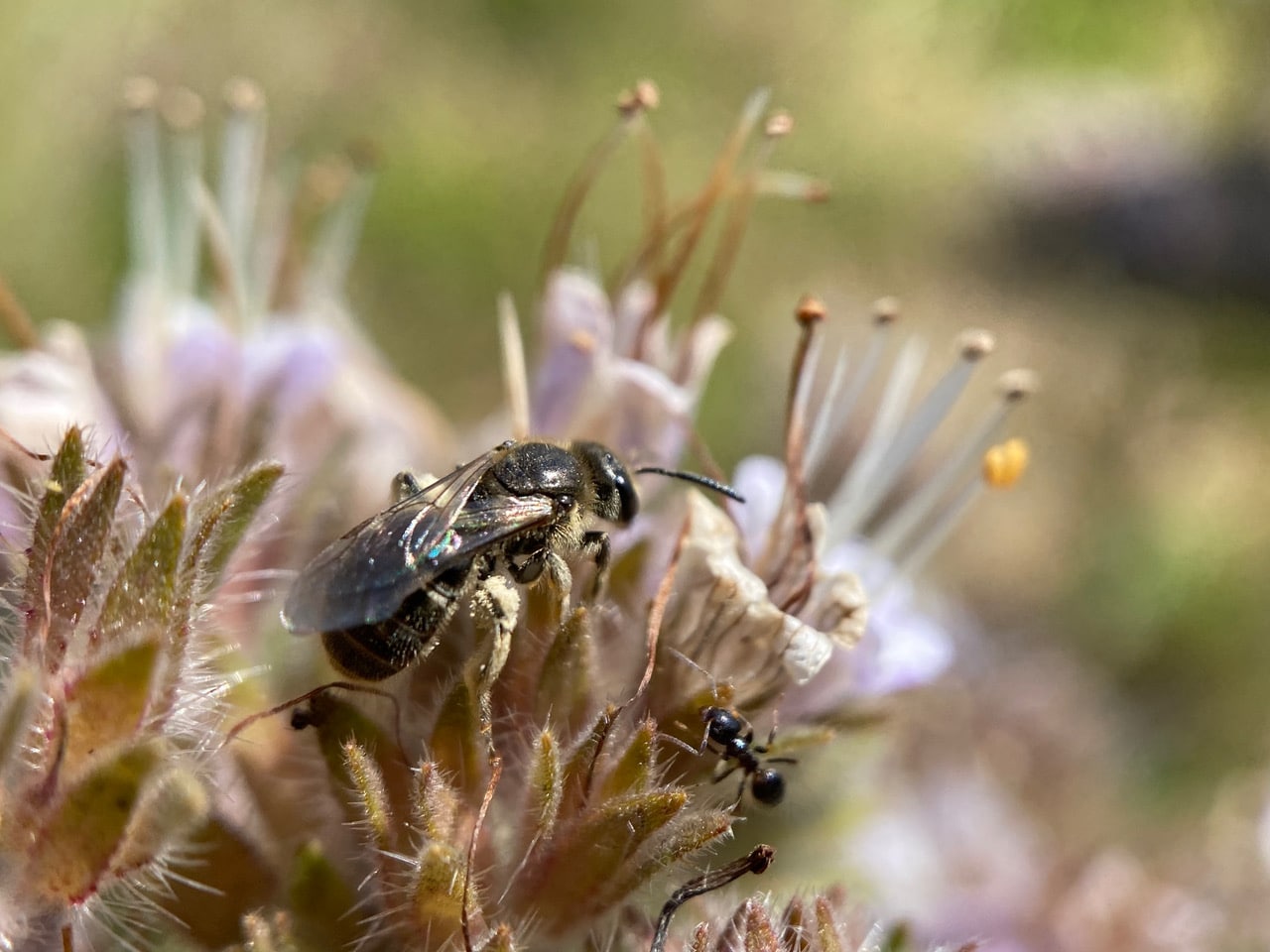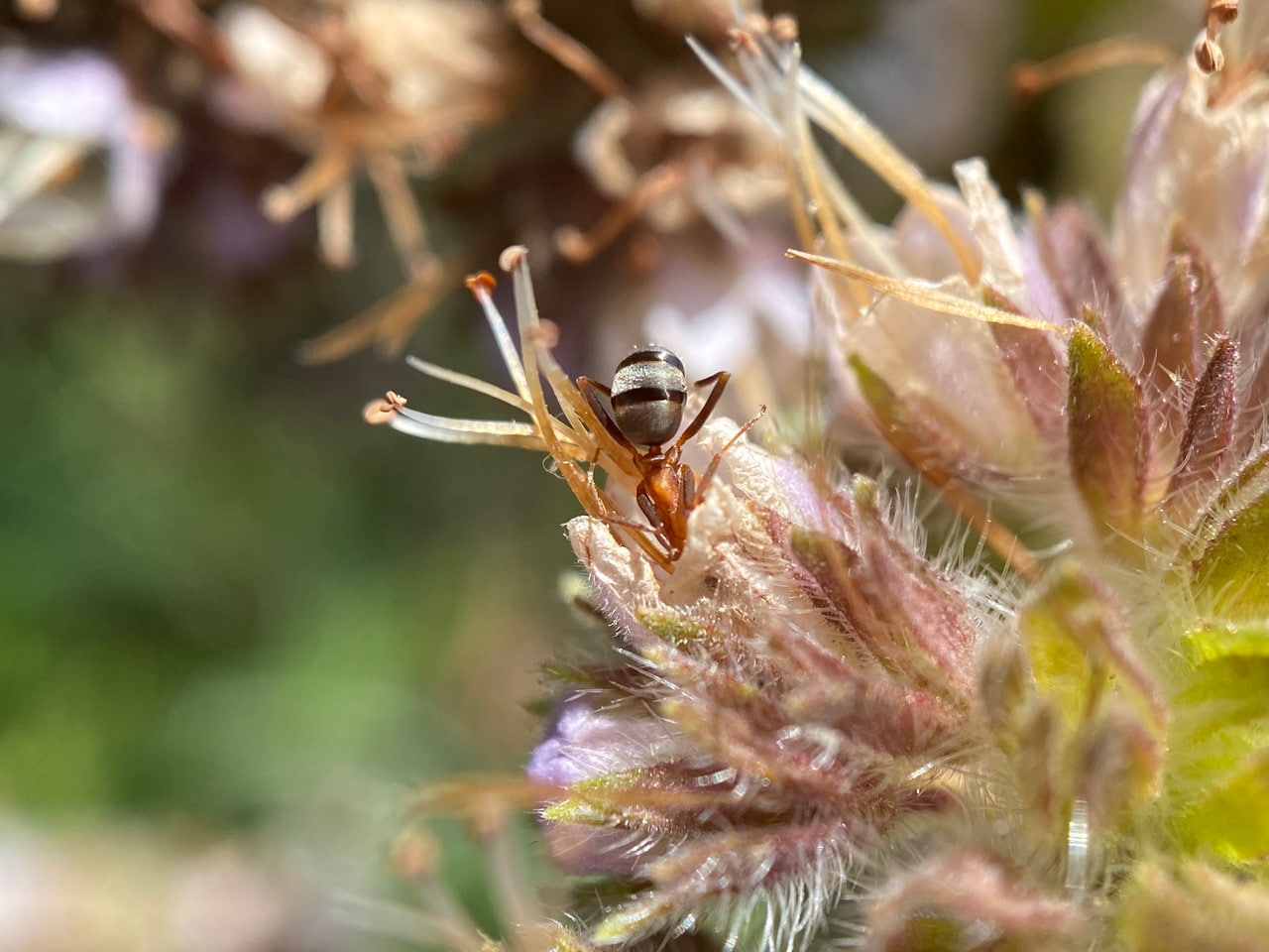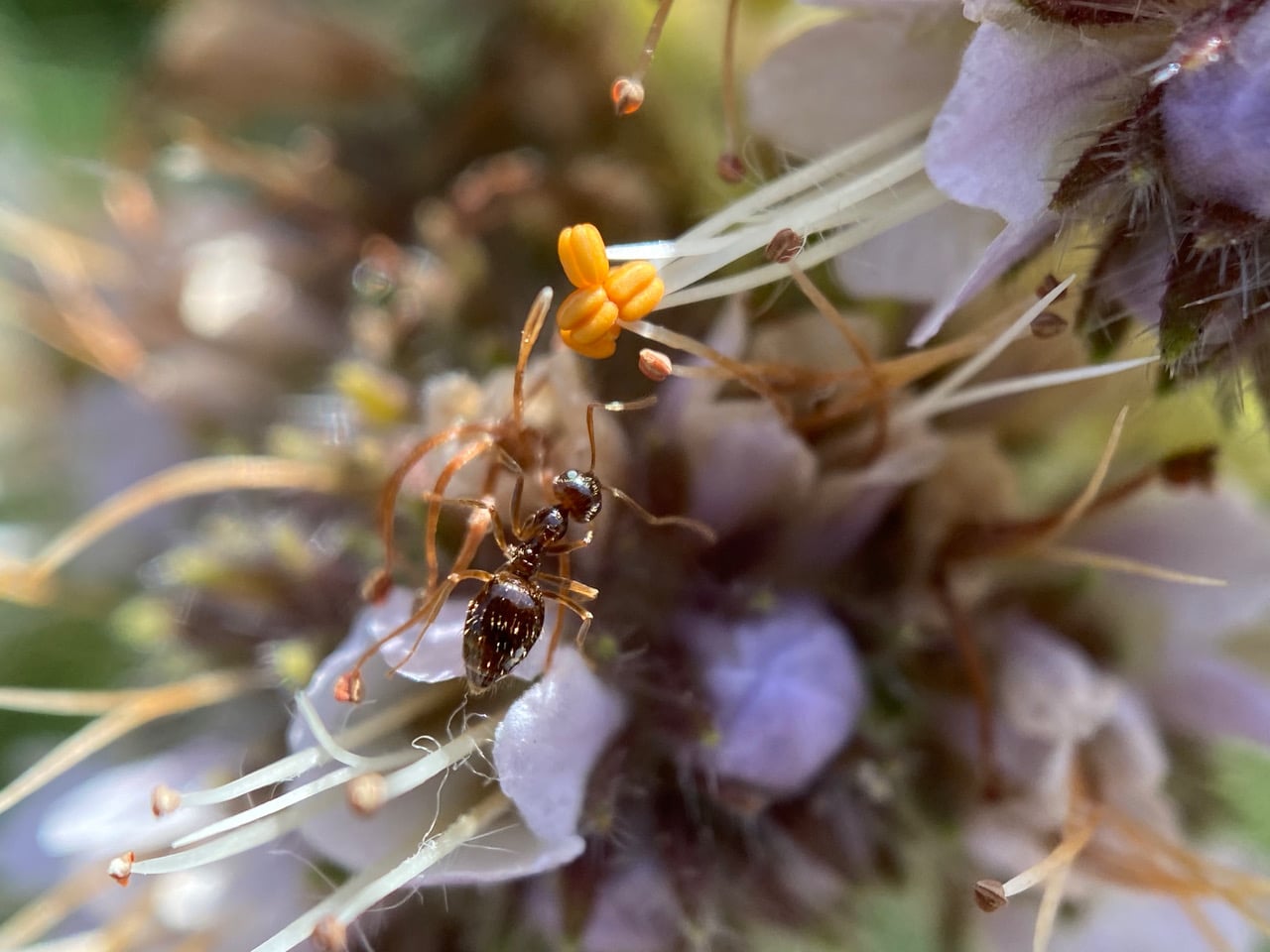 Surprisingly there’s an ant of another species on an adjacent phacelia inflorescence of the same plant. Aren’t ants territorial about their foraging turf? This American Winter Ant, Prenolepis imparis is quite a bit smaller than the Field Ant we just saw.