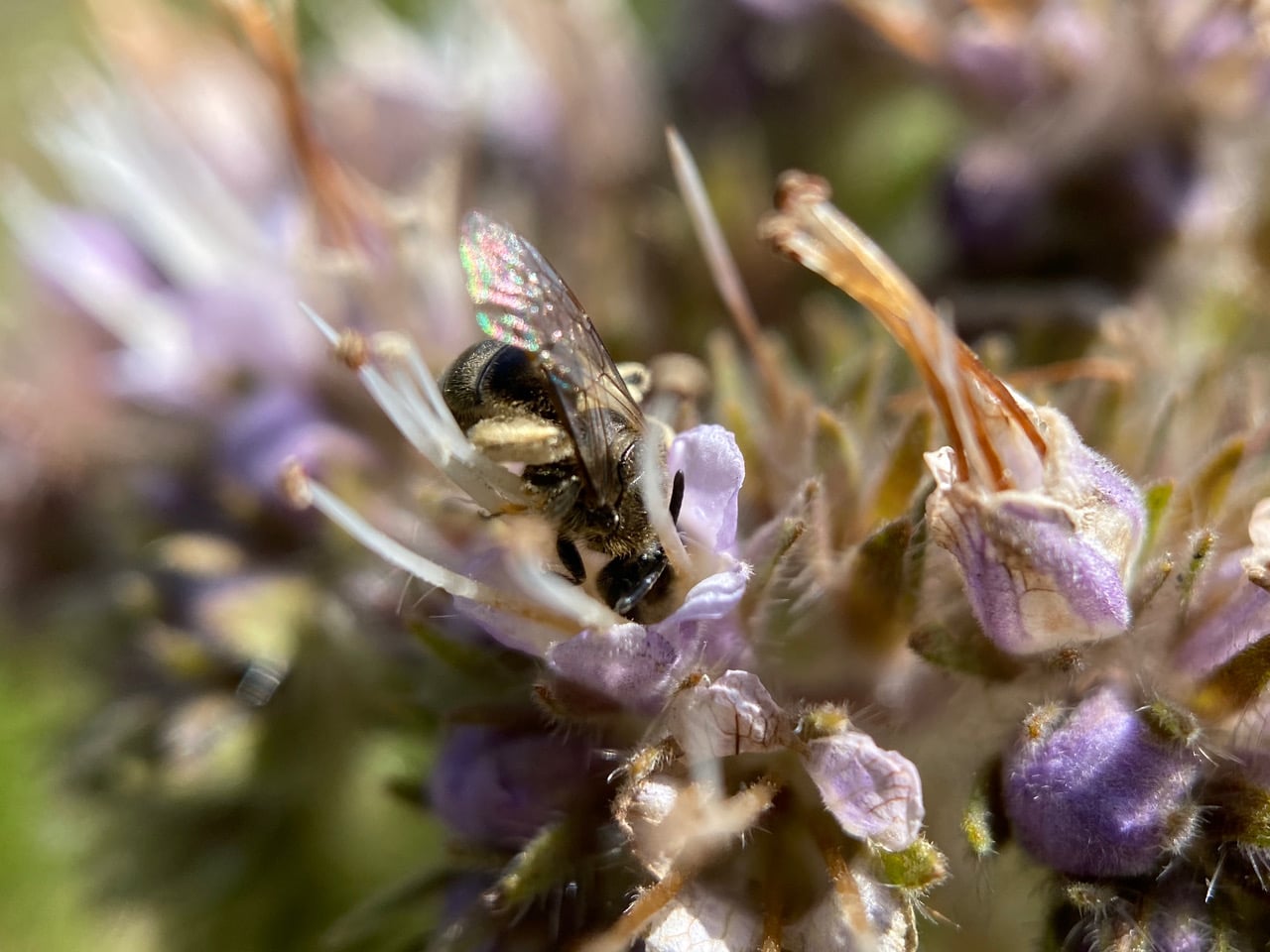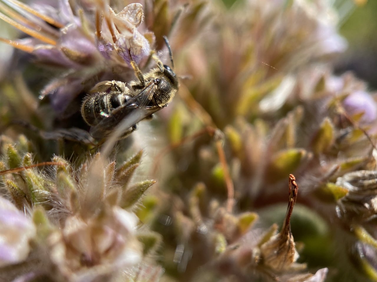 The constant Bumble Bee frenzy over the phacelia makes it hard for the smaller bees to access the flowers. Their visits are quick and furtive. It takes all the focus I can muster to photograph them now.