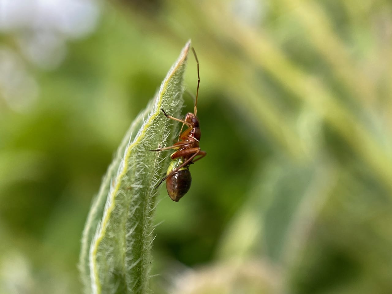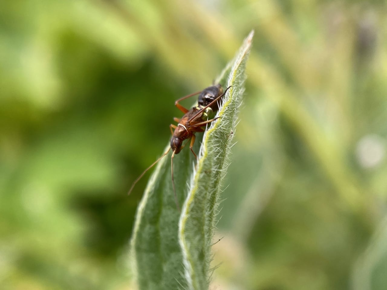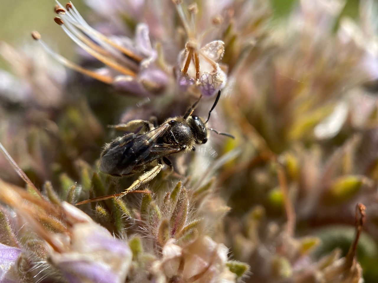 A small insect basking on a California Phacelia leaf gives me the slip as I approach with the camera. A fleeting look at its mouthparts confirms my suspicions – it is not an ant, but a true bug with a piercing-sucking mouthpart folded under its body.