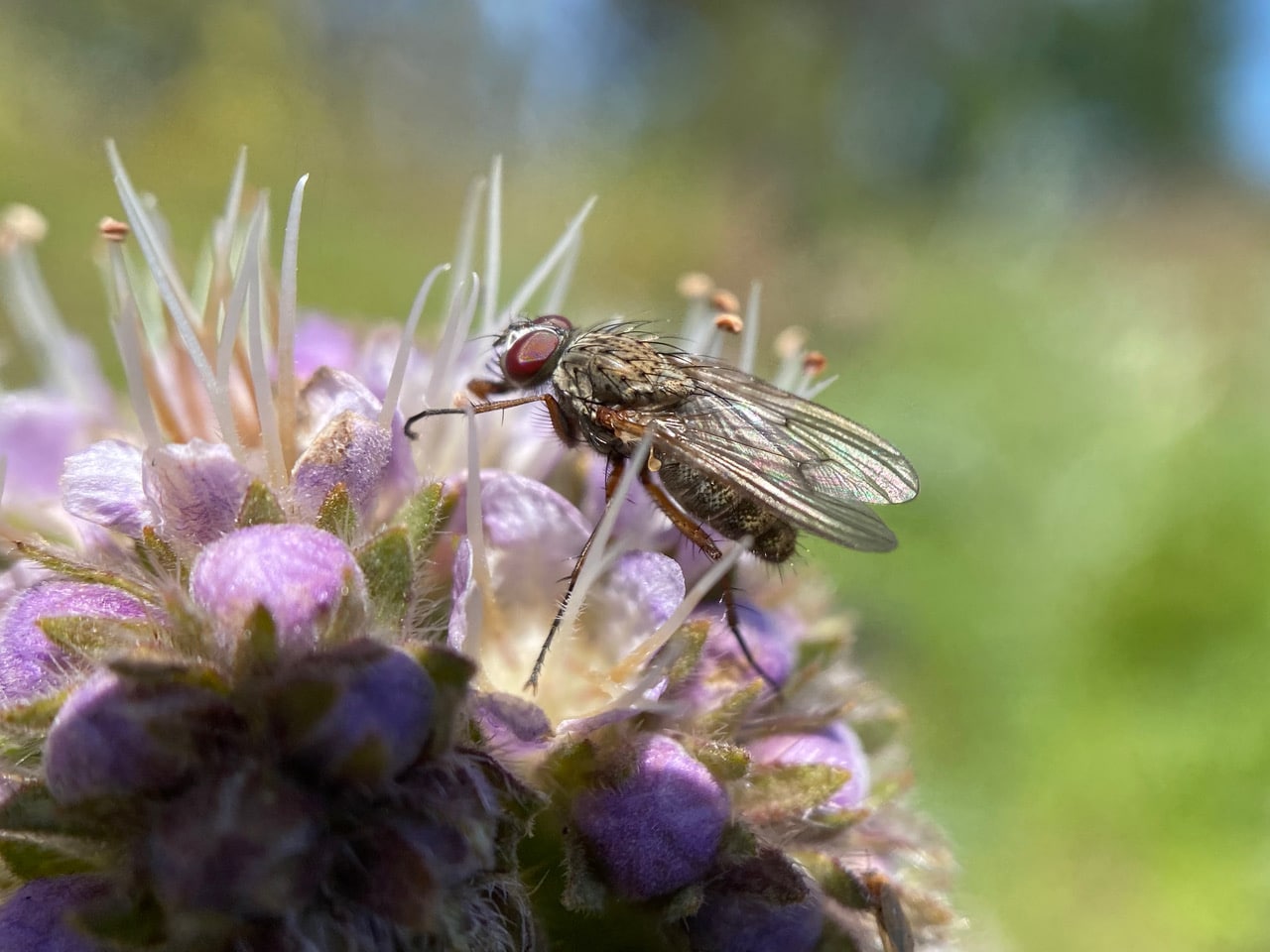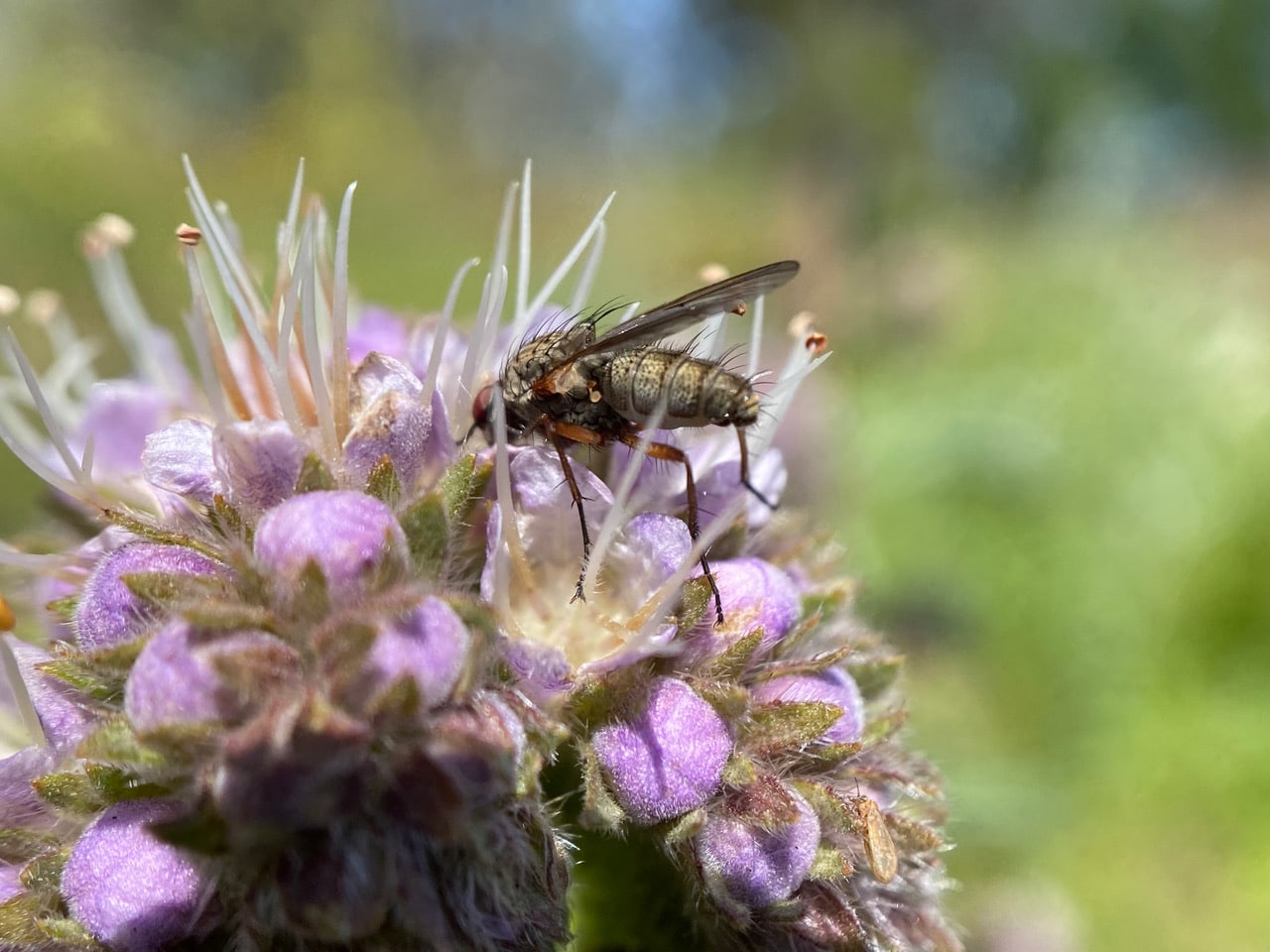 A Bristle Fly (family Tachinidae) is quietly taking nectar from a Phacelia flower.