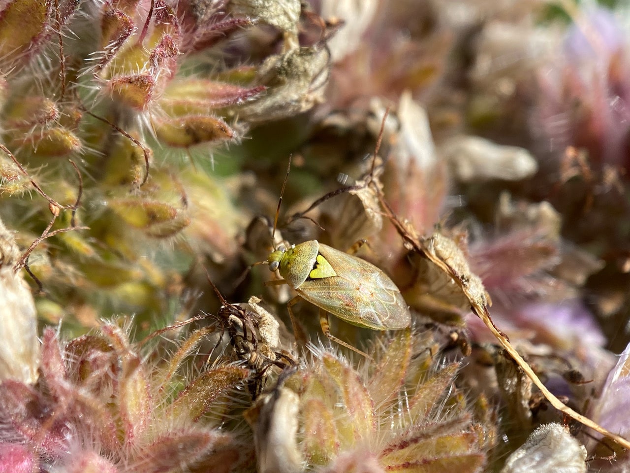 It is much harder to spot a Western Tarnished Plant Bug, Lygus Hesperus (family Miridae) among the debris on a California Phacelia inflorescence.