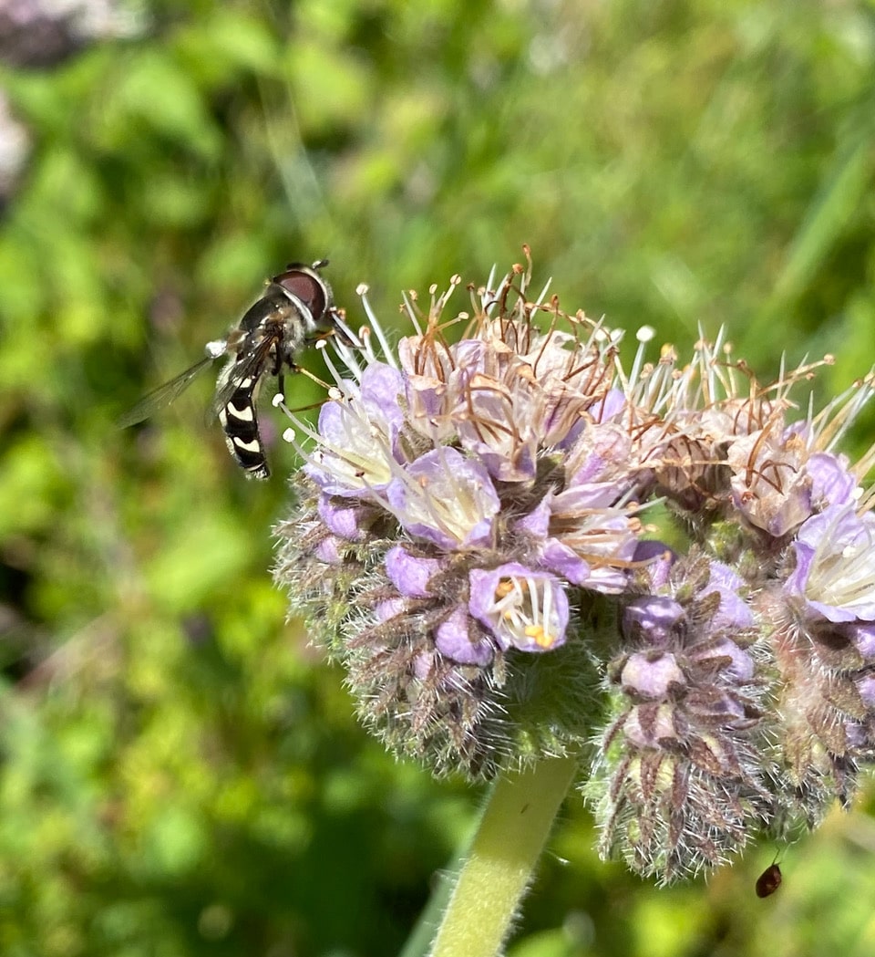 The predominant insect species currently enjoying the California Phacelia’s abundance is the Yellow-faced Bumble Bees, Bombus vosnesenskii. There’s a constant buzz of activity over the flower clusters. The bumble bees are making up for their slow start this year.
