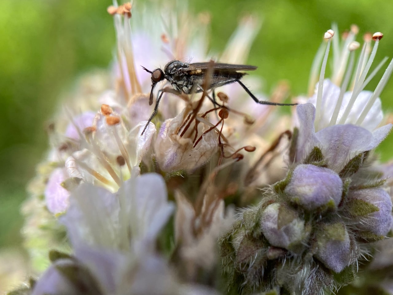 I take a close look at an inflorescence of California Phacelia. Not only are the flowers a good source of nectar, they also offer their pollen generously and freely. The long stamens are fully exserted, making pollen gathering a walk in the park for the pollinators.