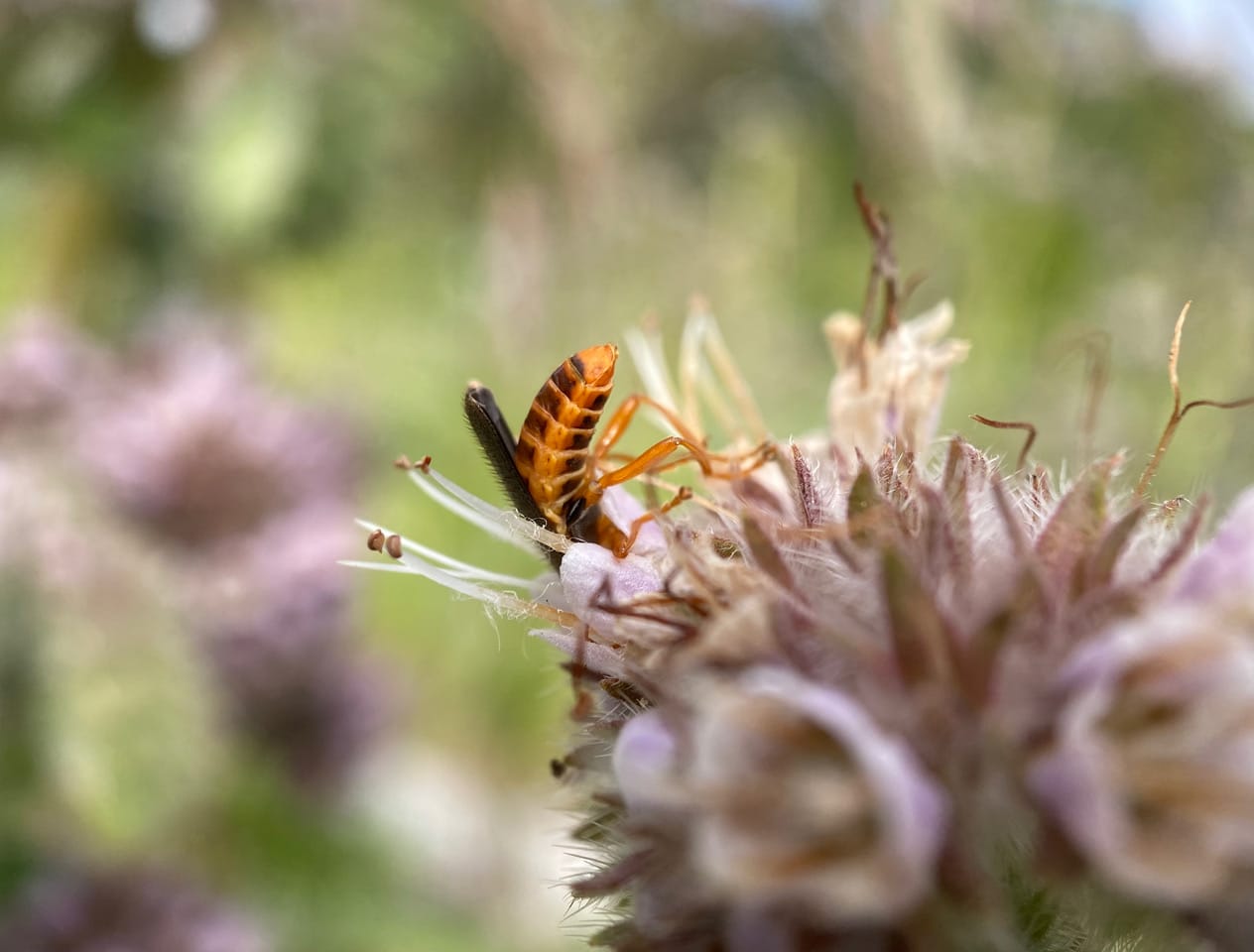 The insect is so enthralled with Phacelia’s nectar, I have to wait a while to see the rest of its body. It is a Soldier Beetle, Cultellunguis Americanus (family Cantharidae).