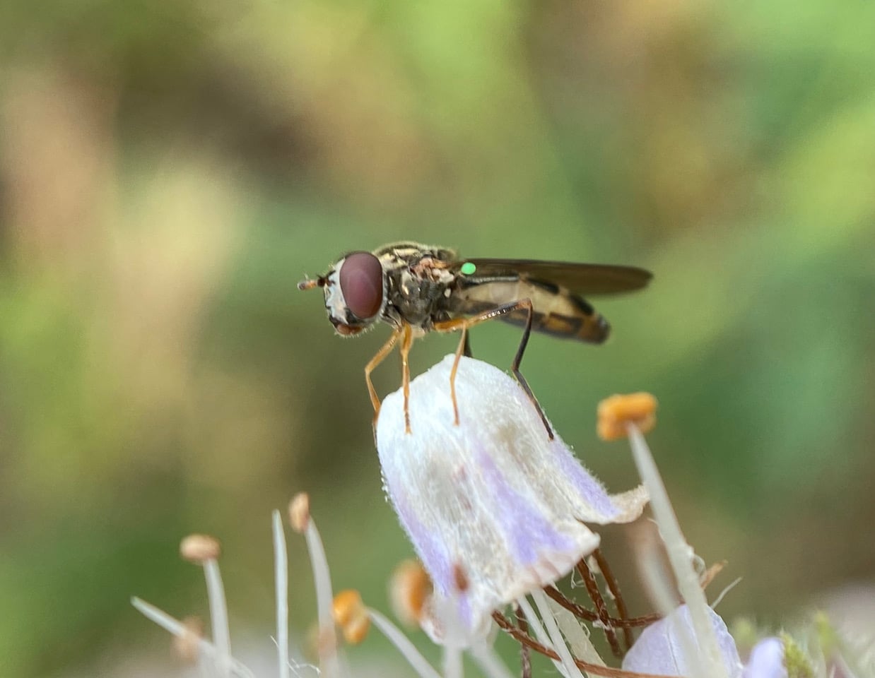 While photographing a dusky, metallic Hover Fly foraging on the Phacelia flowers, I suddenly notice that it has a glowing green spot on its side near the wing. Is this yet another of the Sedgesitter’s optical magic acts? I recall seeing this once before but was not successful in capturing a picture.