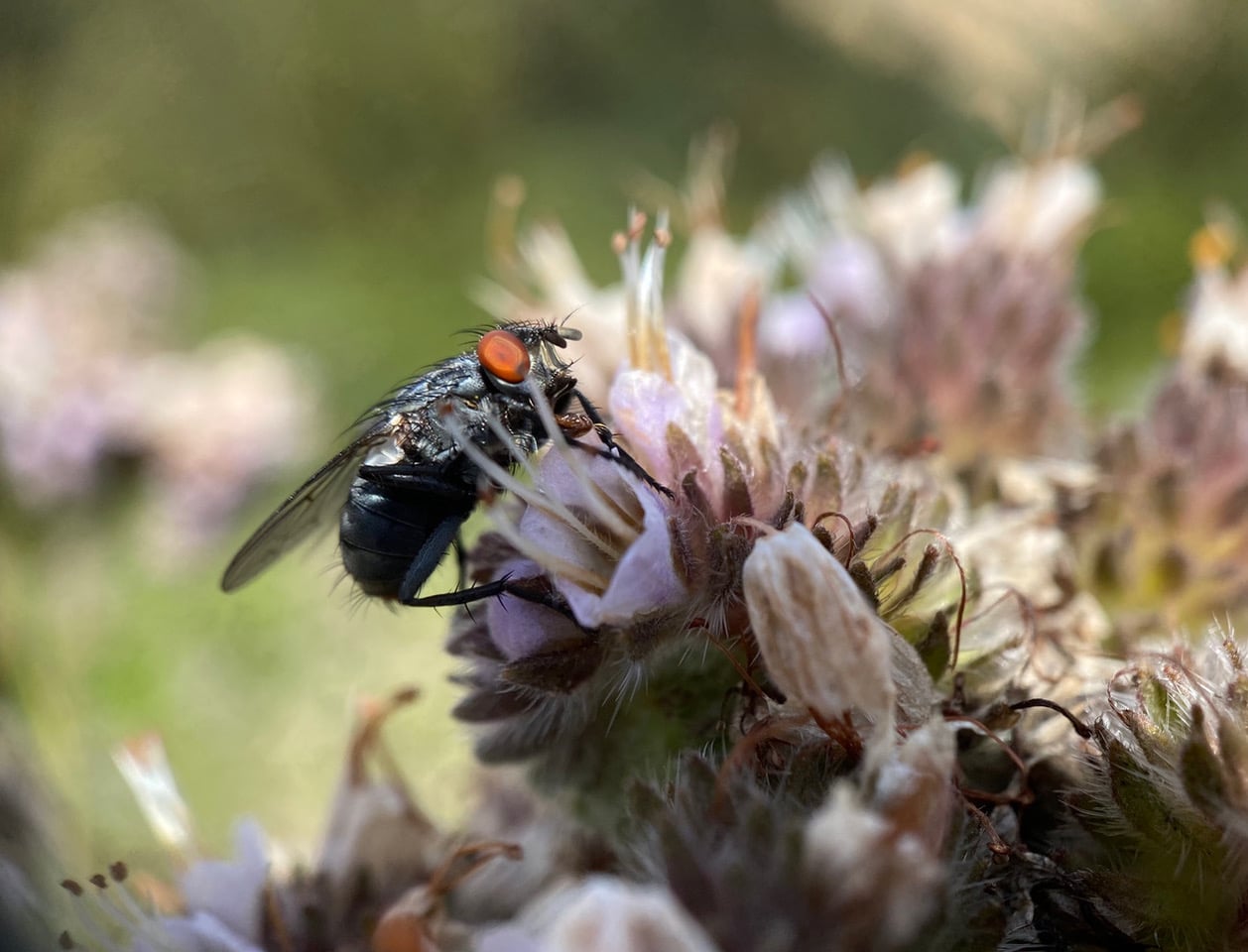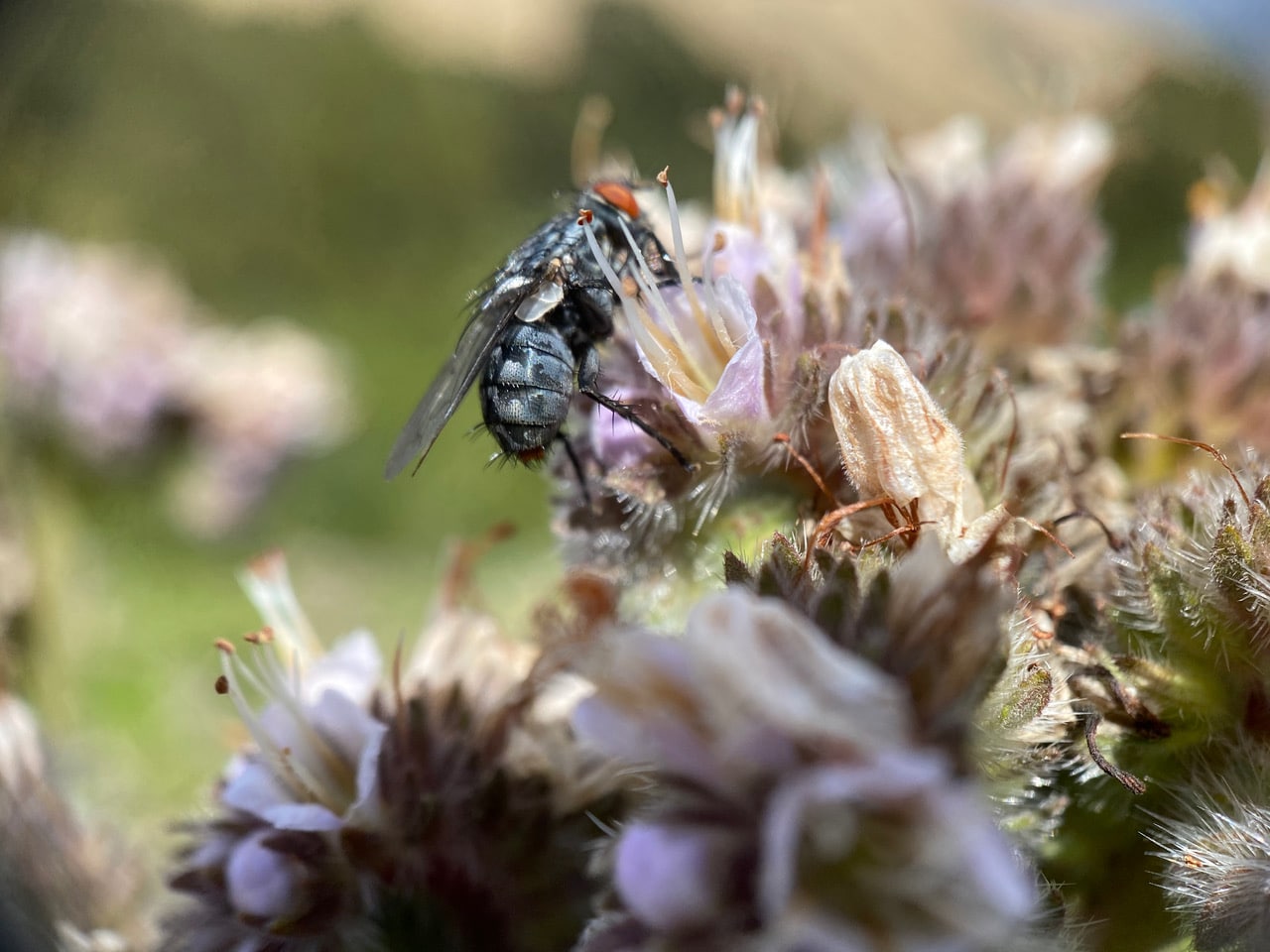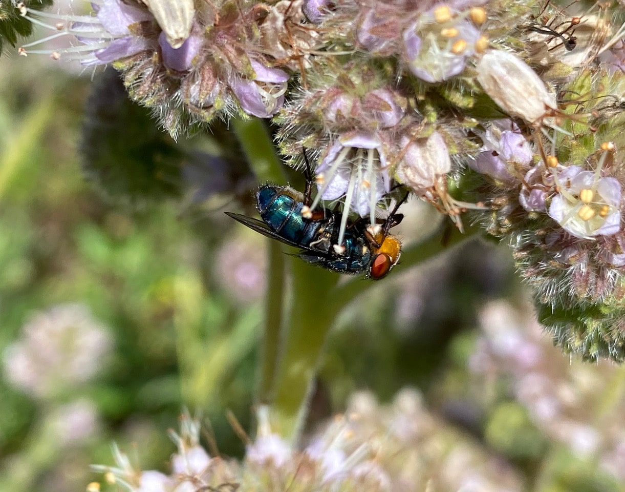 I am seeing more and more of the Secondary Screwworm Flies, Cochliomyia macellaria (family Calliphoridae) lately, foraging on the California Phacelia. They are one of the most beautiful flies around, but are usually ignored because of their abundance.