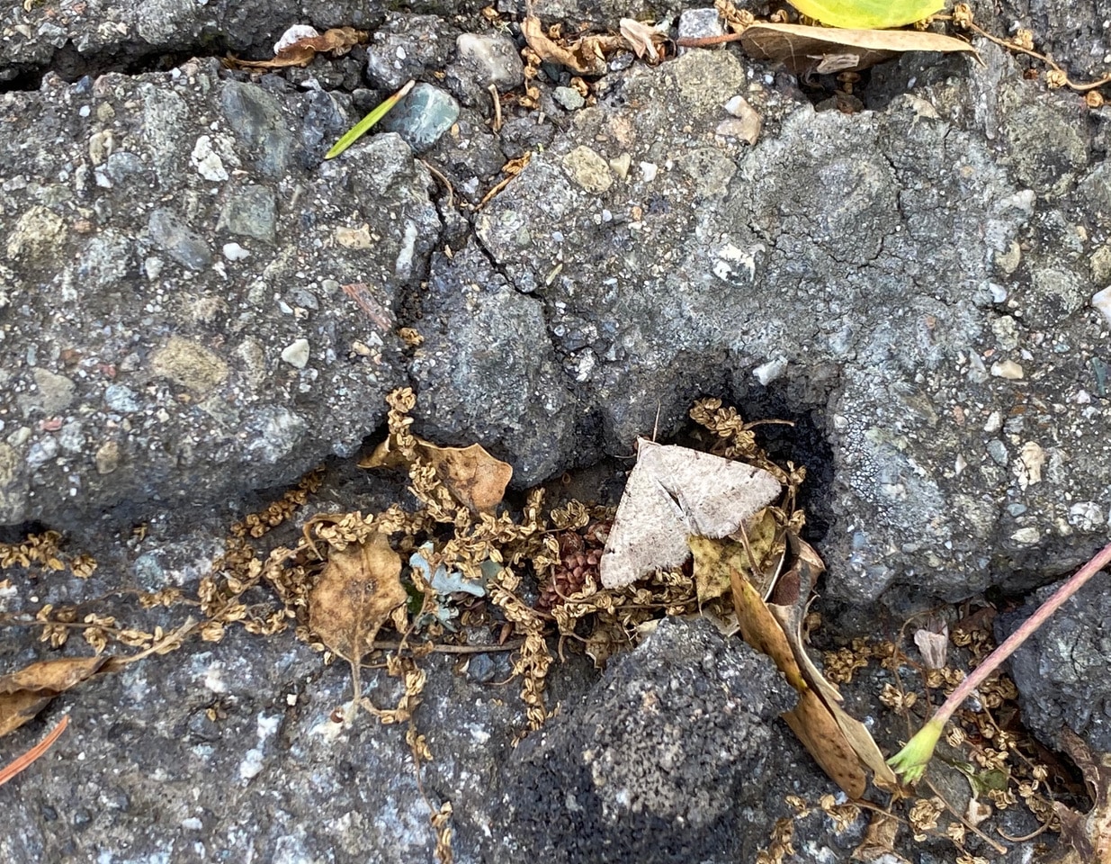 Little moths frequently flutter along the road, then disappear as soon as they land in the vegetation. They are skittish and resist getting their photos taken. This one happens to land in a crevice on the asphalt. I wonder if it could ever be identified?