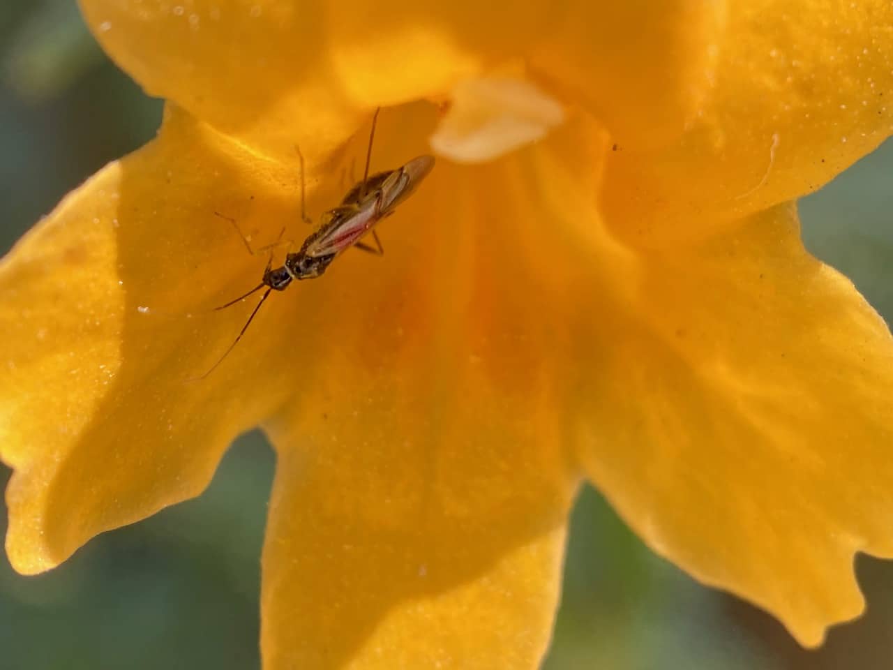 A Phacelia Plant Bug, Tupiocoris californicus (family Miridae) is crawling out of a Sticky Monkeyflower. The genus is mostly found in western North American from California to Baja. Sometimes I wonder if the common name isn’t a misnomer. I have never seen this bug on Phacelia, but have mostly found it on the tarweeds. In fact, it is one of the guild of bugs that are specialized for living on sticky plants. It can navigate the glandular hairs with the greatest of ease.