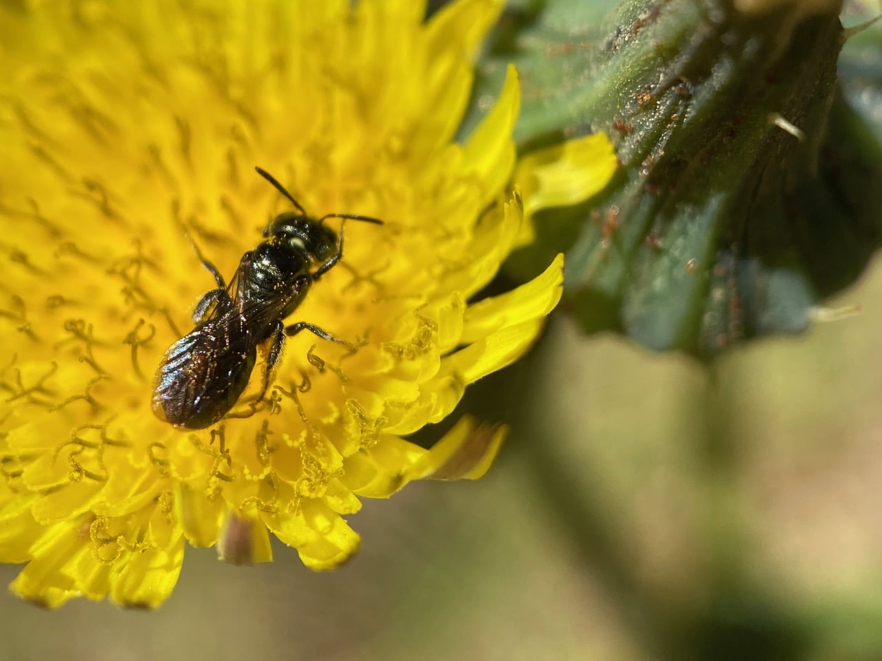 A Small Carpenter Bee, Ceratina sp. (family Apidae) is foraging on a Dandelion flowerhead.