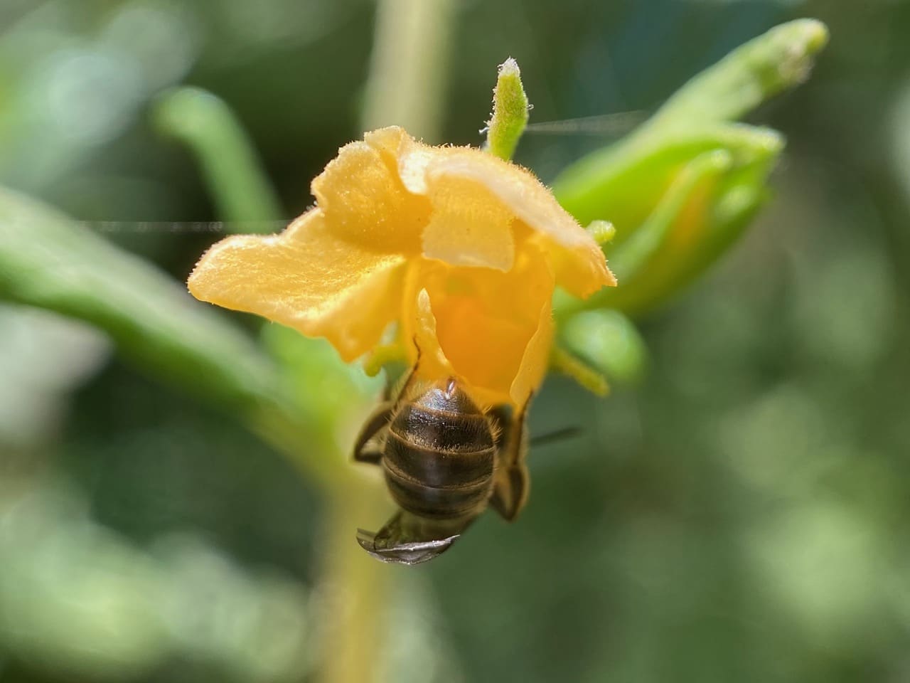 A bee has landed on a Sticky Monkeyflower. There appears to be a “furrow” on the last segment of her abdomen. A Furrow Bee, Halictus sp. (family Halictidae)?