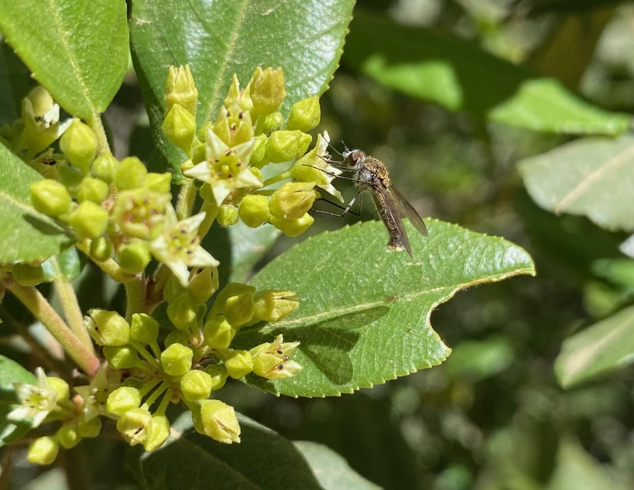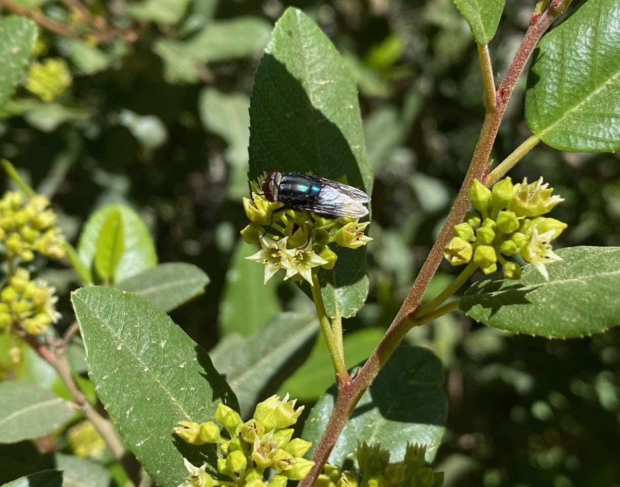 A Secondary Screwworm Fly is foraging on the Coffeeberry flowers.