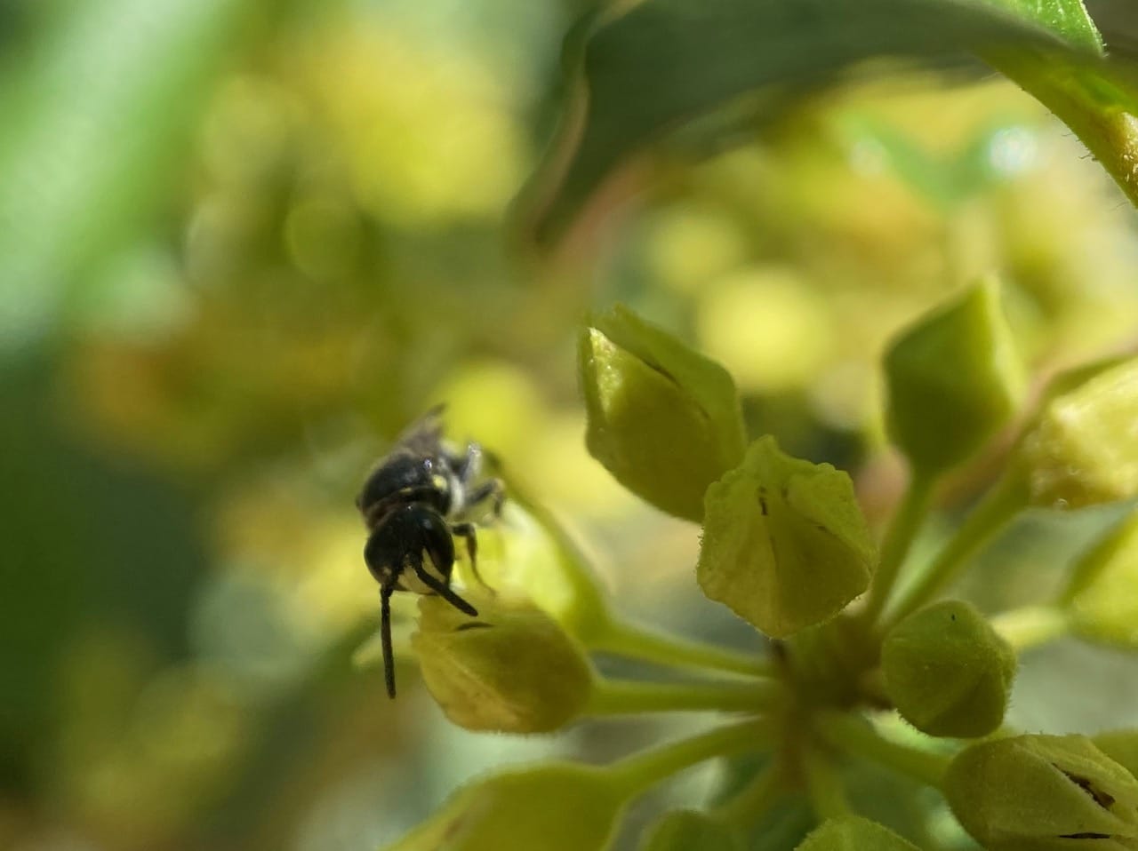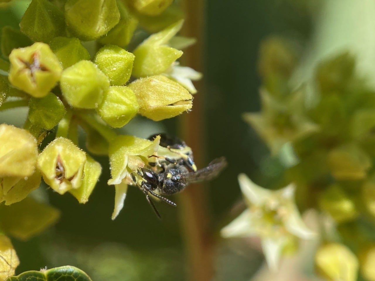 The male Masked Bee, Hylaeus sp. (family Colletidae) is seeking nectar from the young flowers of Coffeeberry in the shade. Note the prominent yellow markings on his face. Male bees do not collect pollen to provision the nest, but do visit flowers for nectar, and to meet with potential mates.