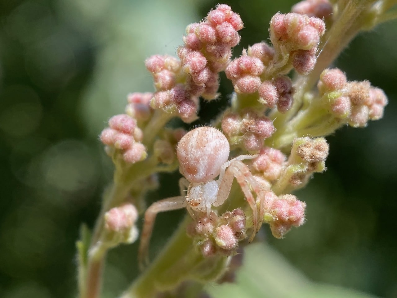 A small, well-camouflaged Crab Spider, Mecaphesa sp. (family Thomisidae) is waiting in ambush among the pink flower buds of an Ocean Spray, Holodiscus discolor.
