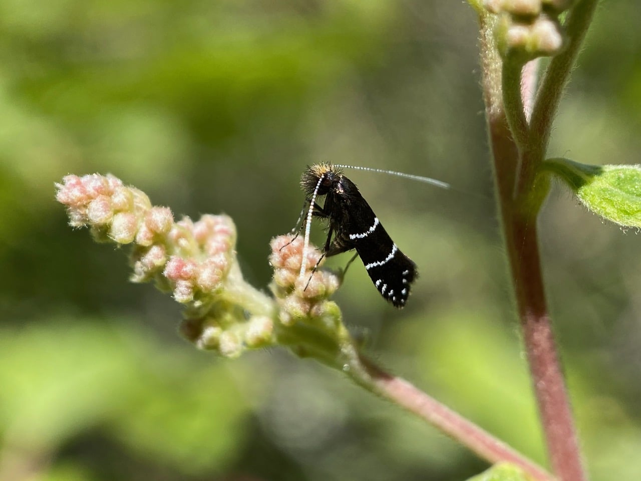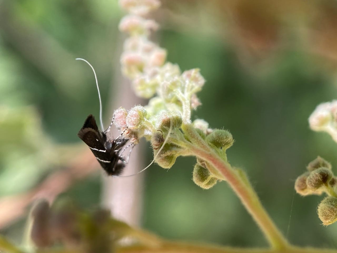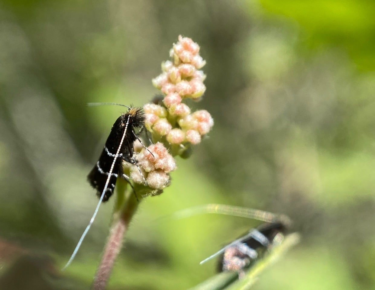 A female Ocean Spray Fairy Longhorn Moth is laying eggs on a cluster of Ocean Spray flower buds.