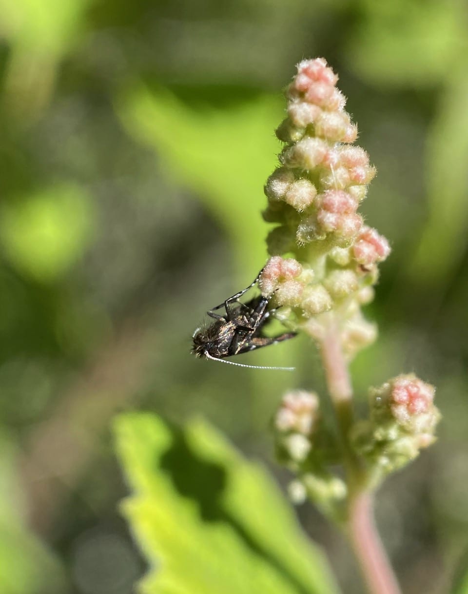 I am happy to see more Ocean Spray, Holodiscus discolor with flower buds today – the plants have finally caught up, about a month late. But where are the Ocean Spray Fairy Longhorn Moths, Adela septentrionella (family Adelidae)? I don’t see any moths dancing over the branches – apparently the courtship season is over. However there are a few females on the flower buds, apparently finishing up their job of laying eggs. The females are recognizable from their shorter antennae, and some orange hairs on their heads.