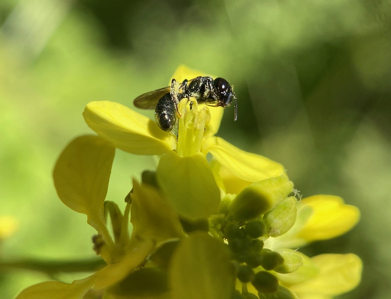 A Small Carpenter Bee, Ceratina sp. (family Apidae) appears to be taking nectar from a Wild Mustard flower.