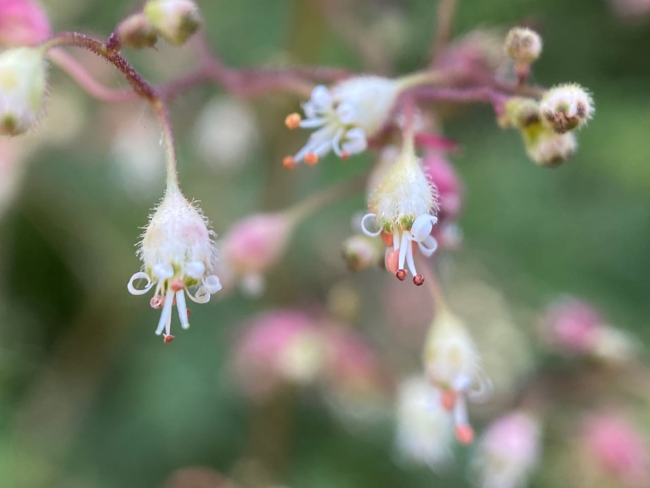 I am delighted to come across a small patch of Alum Root, Heuchera sp. in bloom. The tiny white flowers are held in pendulous loose sprays. The flowers are composed of a hairy bell-shaped calyx holding petals that emerge in curly straps. The protruding stamens with orange-pink anthers feature prominently in the center.