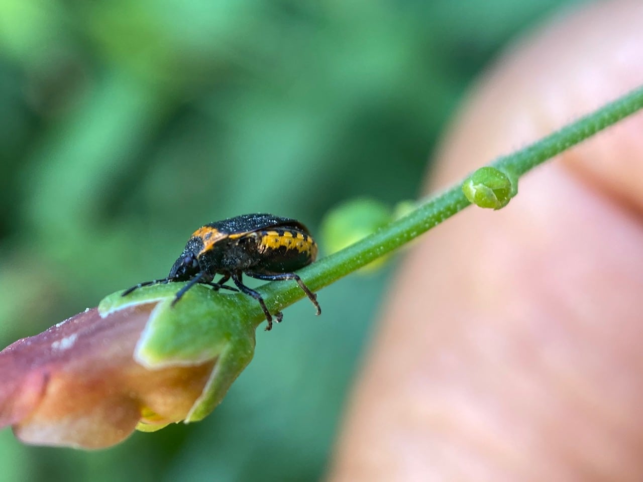 The Stink Bug, Cosmopepla uhleri (family Pentatomidae) is an insect commonly found on the Bee Plant, its host plant.