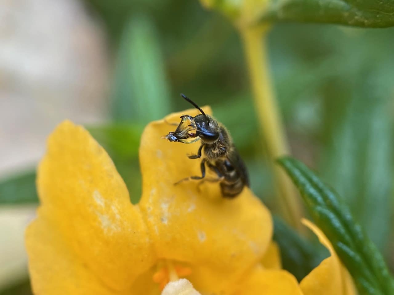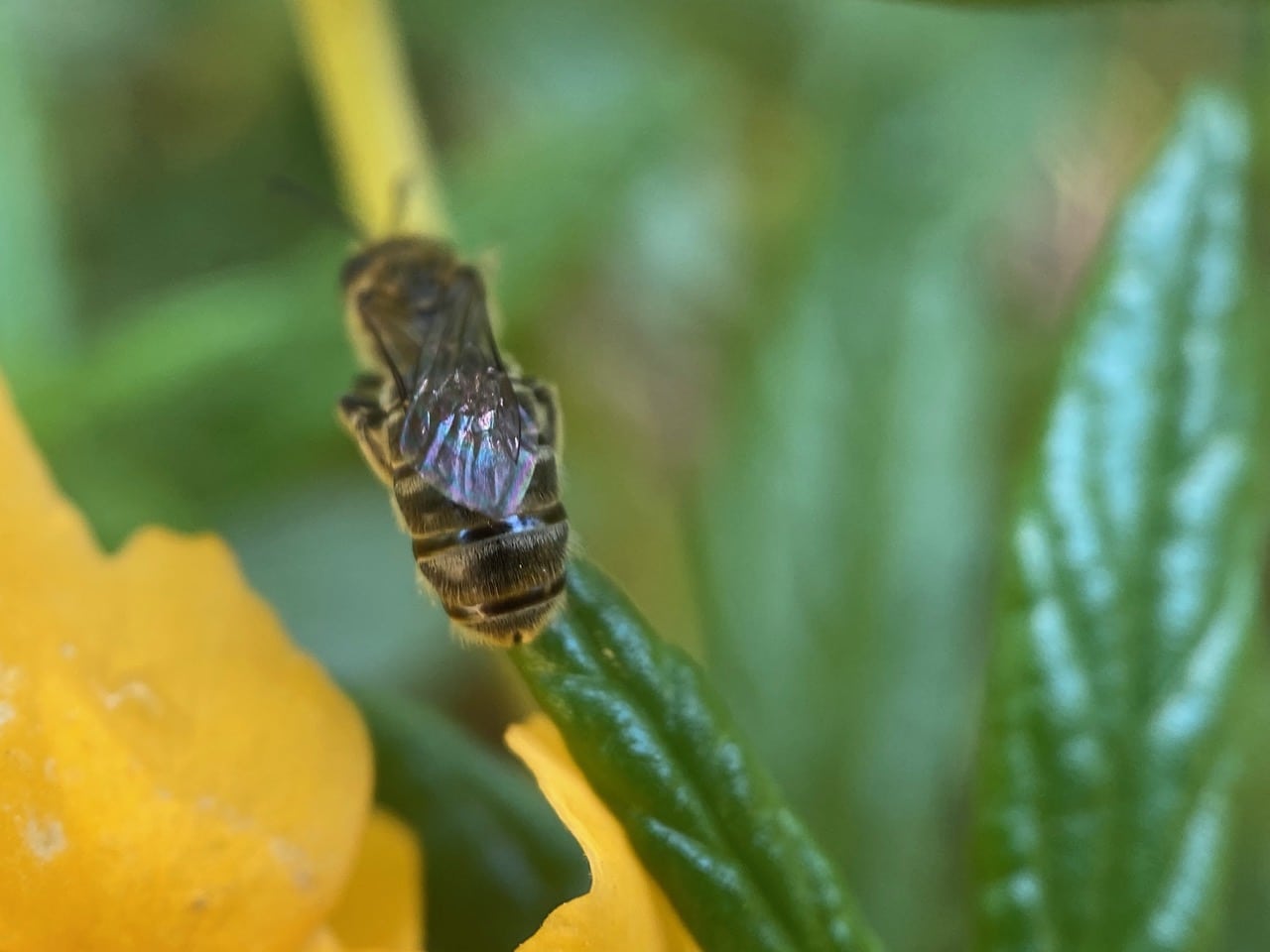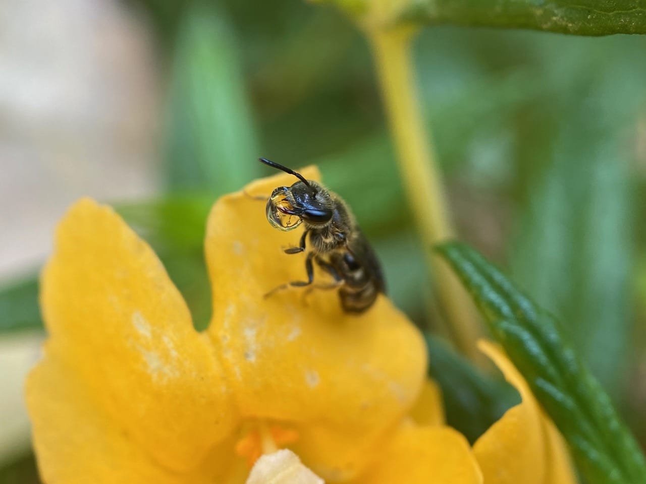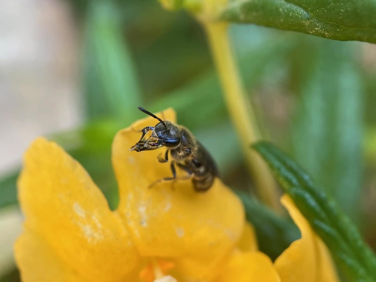 I spot something glistening on a Sticky Monkeyflower, Diplacus aurantiacus. Closing in, it is a bubble of liquid held in the jaws of a little bee. Is this a female Masked Bee, Hylaeus sp. (family Colletidae) known for “blowing bubbles”? No, the bee is larger than Hylaeus, and it has no yellow marking on its face. There appears to be an empty scopa on its hindleg. All these features preclude the ID of a Masked Bee.