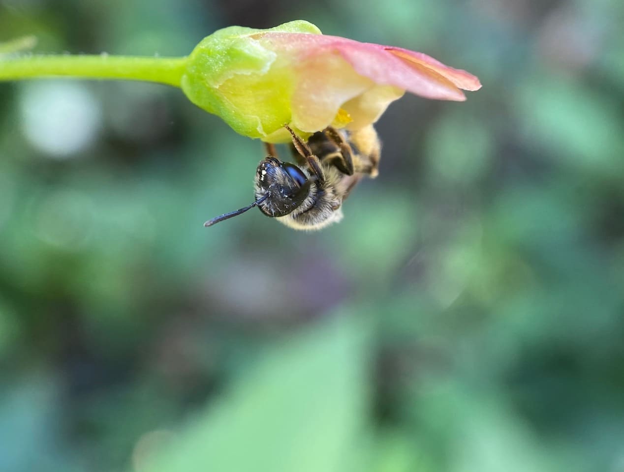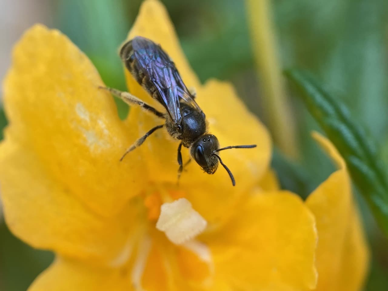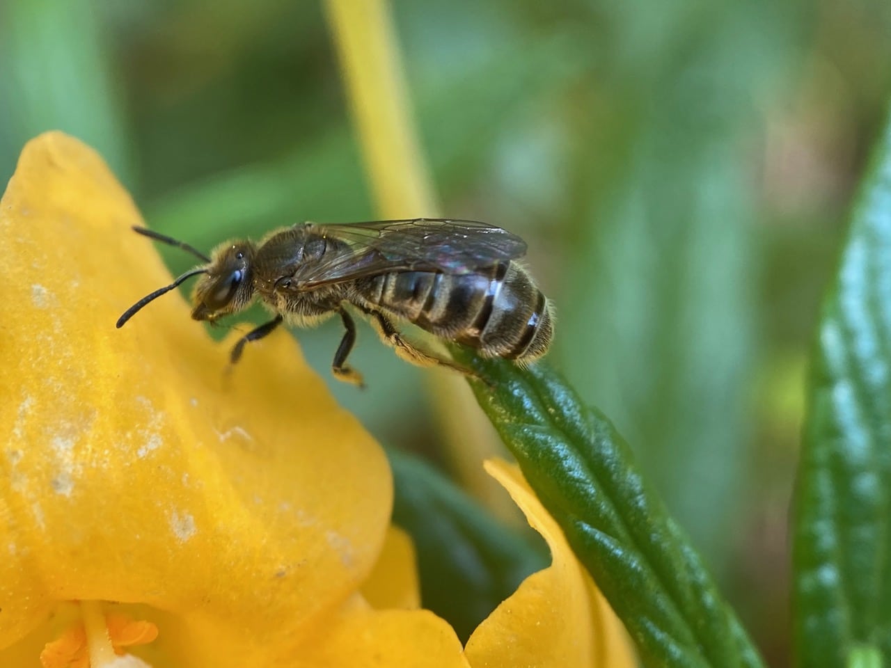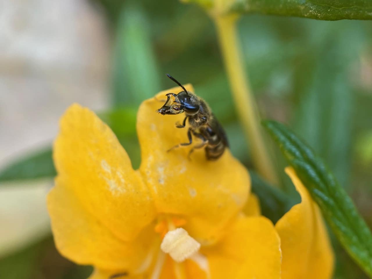 I spot something glistening on a Sticky Monkeyflower, Diplacus aurantiacus. Closing in, it is a bubble of liquid held in the jaws of a little bee. Is this a female Masked Bee, Hylaeus sp. (family Colletidae) known for “blowing bubbles”? No, the bee is larger than Hylaeus, and it has no yellow marking on its face. There appears to be an empty scopa on its hindleg. All these features preclude the ID of a Masked Bee.