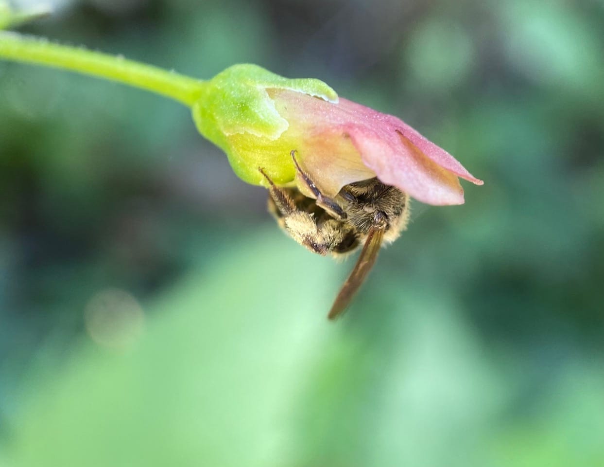 As I watch, the bee works on the bubble by extending and retracting its mouthparts. Rather bizarre how far her jaw can be extruded!