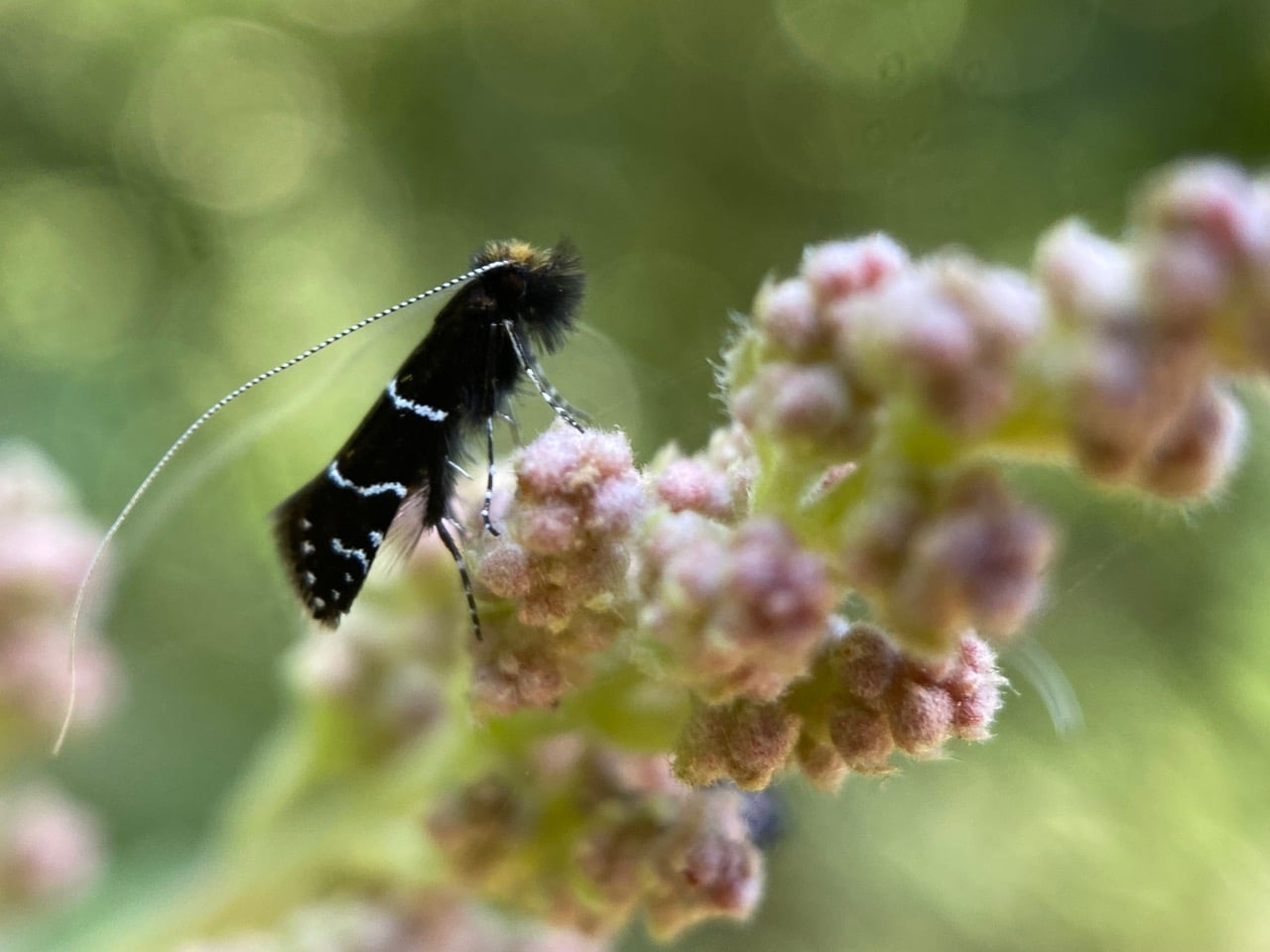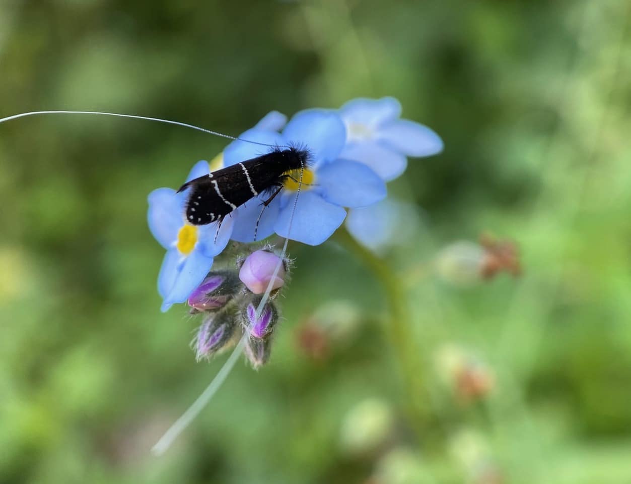 At around noon time, I come across a branch of Ocean Spray, Holodiscus discolor with about half a dozen Ocean Spray Fairy Longhorn Moths, Adela septentrionella (family Adelidae) bobbing up and down in their courtship flight over the flower buds. Ah, there are still some males doing the courtship dance, but they are not in the hundreds that I have seen in past years. Perhaps because of the desynchronized timing of the moths and their host plant this year, the lek gathering is not as elaborate as usual. This is one of the dangers that changing climate pose for the partners in a tight relationship, jeopardizing the reproduction of the insects in this case. I am happy to capture this picture of a male moth on a cluster of Forget-me-not flowers getting some nectar refreshments.