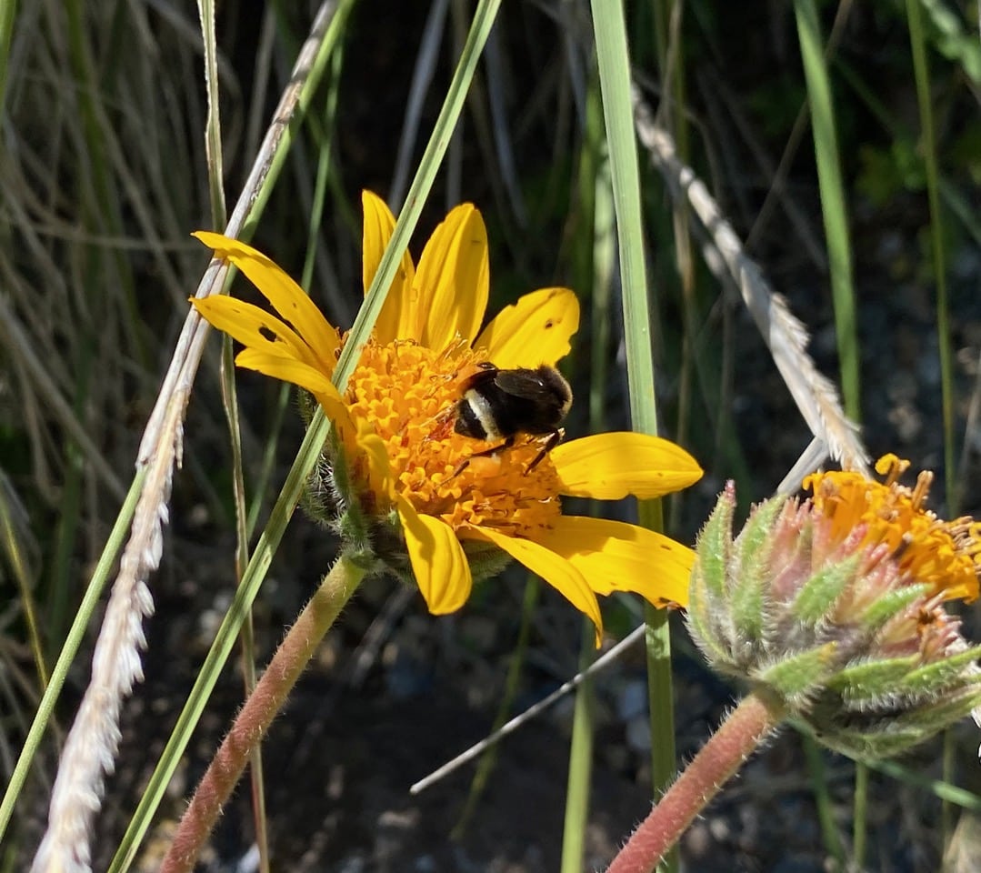 A scruffy Black-tailed Bumble Bee, Bombus melanopygus (family Apidae) is visiting an equally scruffy-looking flowerhead of Narrowleaf Mule’s Ear, Wyethia angustifolia. Why does the bee visit a visually decrepit flowerhead? A closer examination shows that although most of the ray flowers have been lost, there are still fresh disc flowers and buds in the center of the flowerhead. The bee is not fooled by mere appearances.