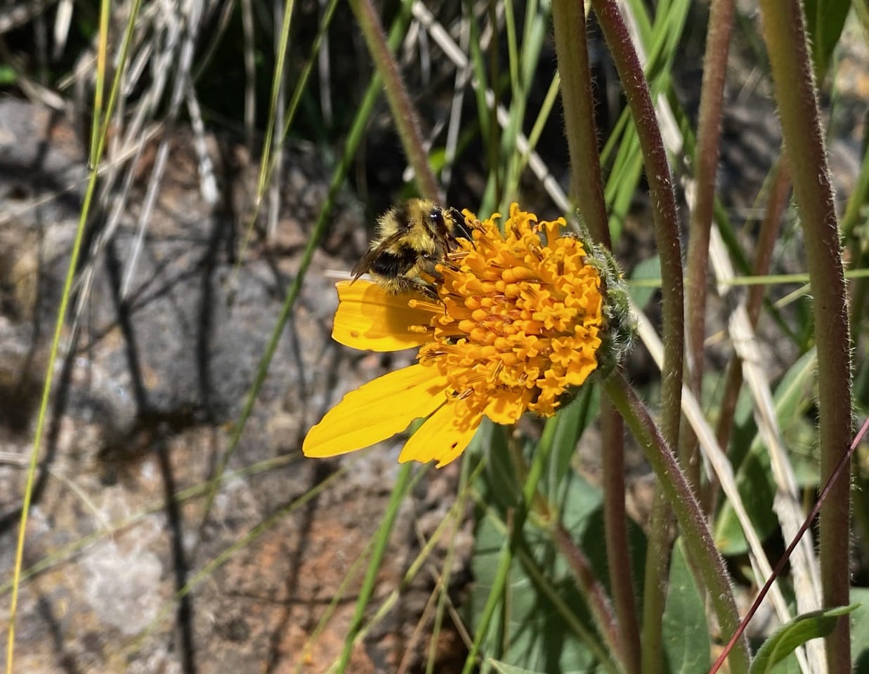 A Yellow-faced Bumble Bee, Bombus vosnesenskii (family Apidae) lands on one of the last intact flowerheads of the Narrowleaf Mule’s Ear.