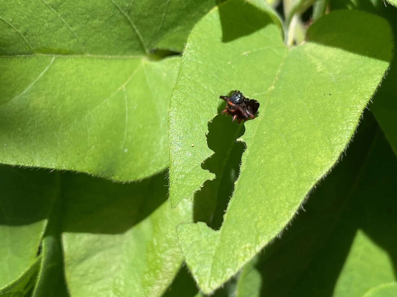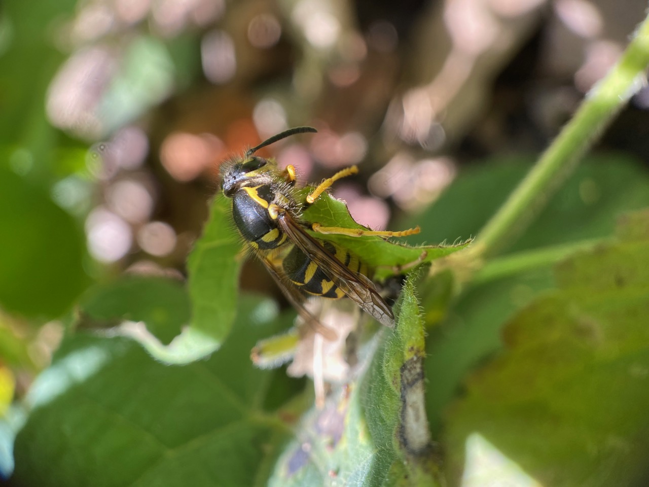 I part the leaves to shed light on the wasp. It still doesn’t move. Is it dead?