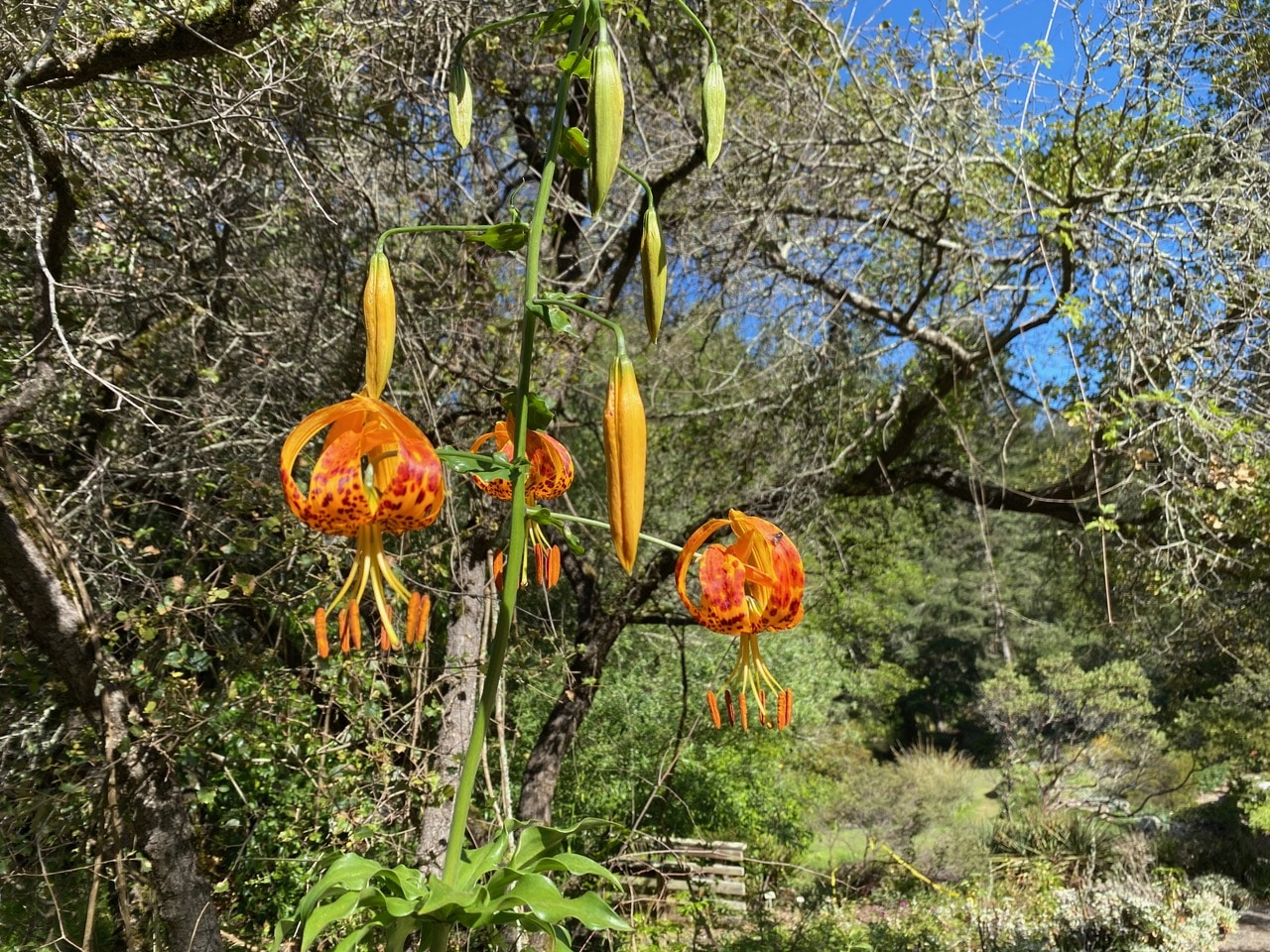 Another large flowered species is blooming profusely at the garden – the striking Leopard Lily, Lilium pardalinum. Like the Western Azalea, the reproductive structures of the flowers are very elongated and extend well beyond the corolla with reflexed tepals. Small insects are not likely to pollinate these flowers. These lilies are pollinated by butterflies, especially the large Swallowtails (family Papilionidae).