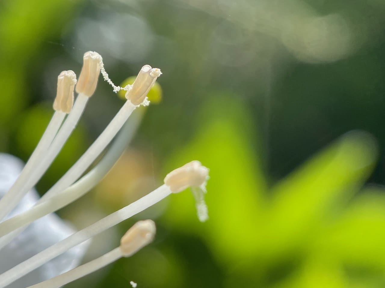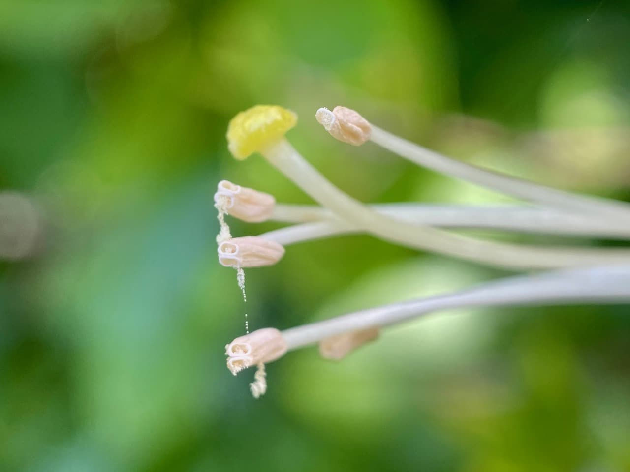 Close-up of the stamens show pollen grains on webby strands (viscin threads) coming off the anthers. Those might have been pulled out of the anthers by the wing of a large butterfly. You can demonstrate this by lightly touching the ends of the mature anthers of the azalea flowers. Strands of viscin thread with pollen grains may come off on your finger.