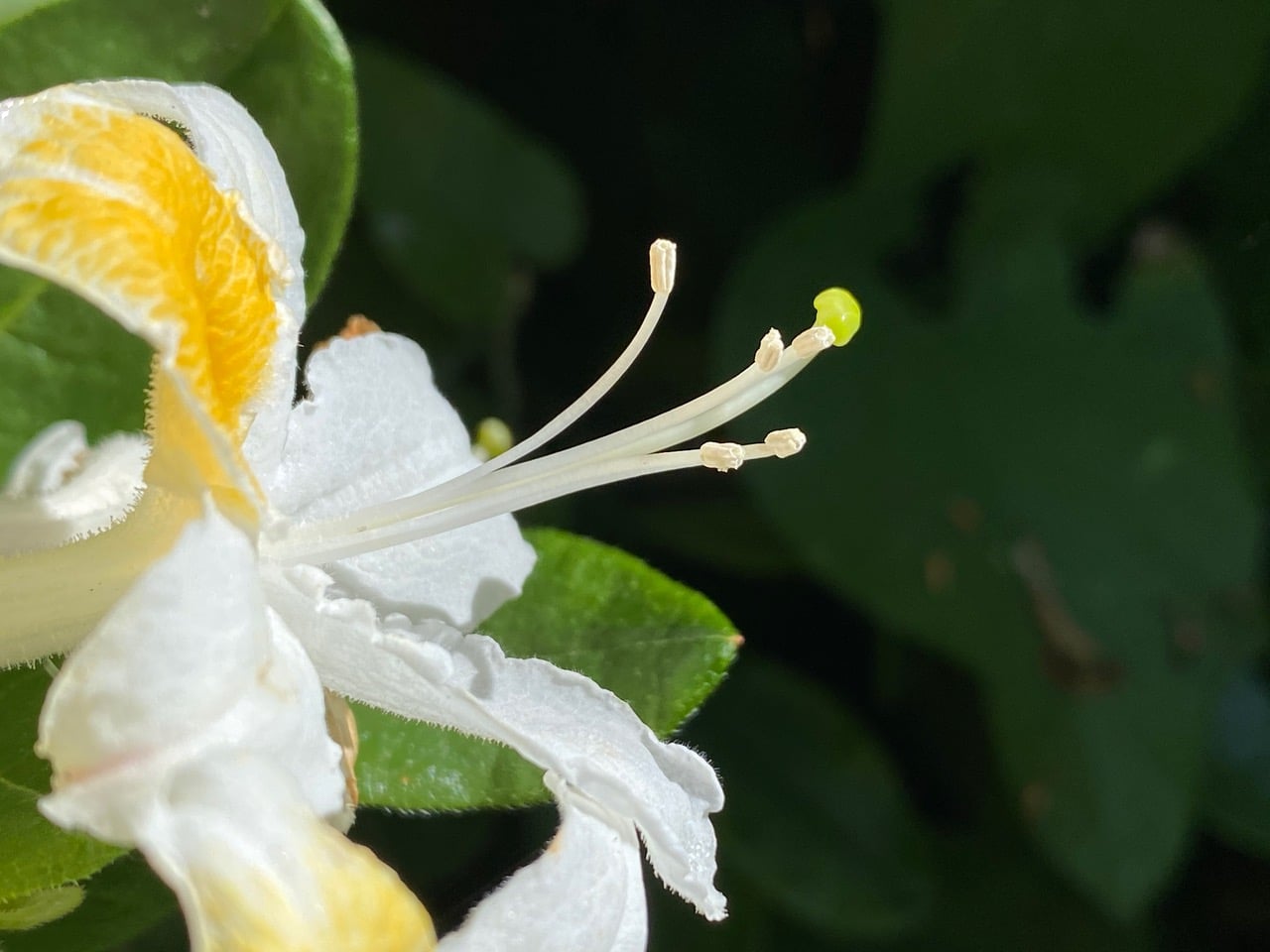 The reproductive structures (both the stamens and pistil) of the large azalea flower are very elongated, protruding a distance from the corolla. The juxtaposition of the parts makes it unlikely for the flower to be pollinated by small insects such as bees. A small insect seeking nectar at the base of the petals is not likely to make contact with the reproductive parts. And a bee collecting pollen on the anthers are not very likely to make contact with the stigma some distance away.
