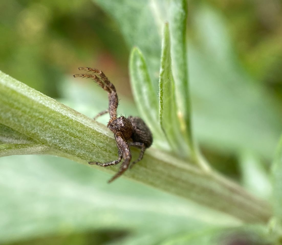 At the approach of my camera, a very dark Ground Crab Spider, Xysticus sp. (family Thomisidae) on the stem of California Mugwort raises its front legs in a defensive gesture.