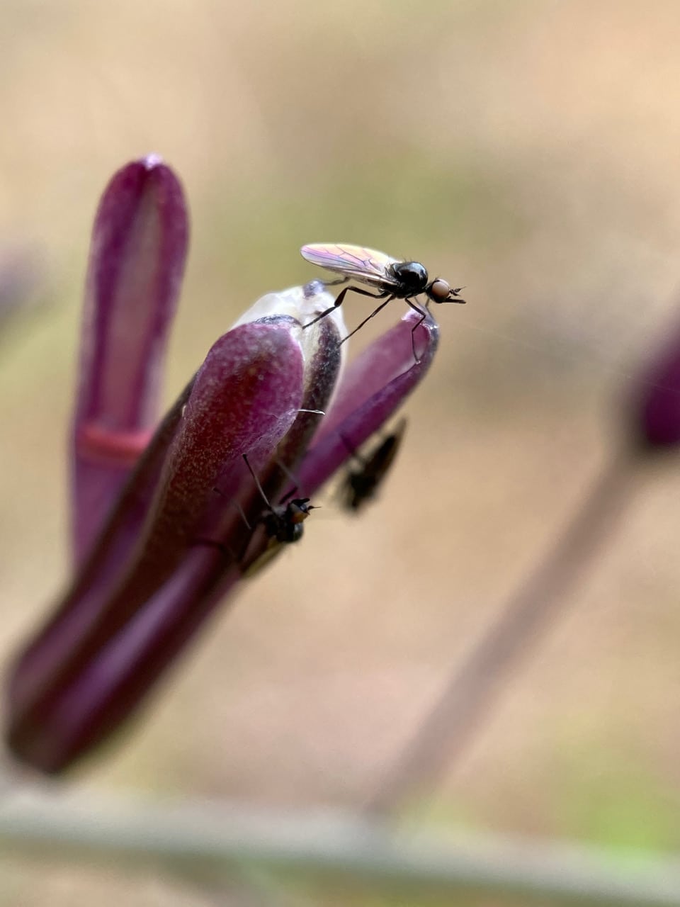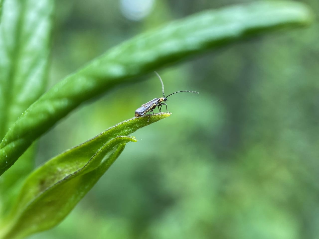 A tiny insect lands on the tip of a flower bud of Sticky Monkeyflower. It looks every bit like a miniature Soldier Beetle.