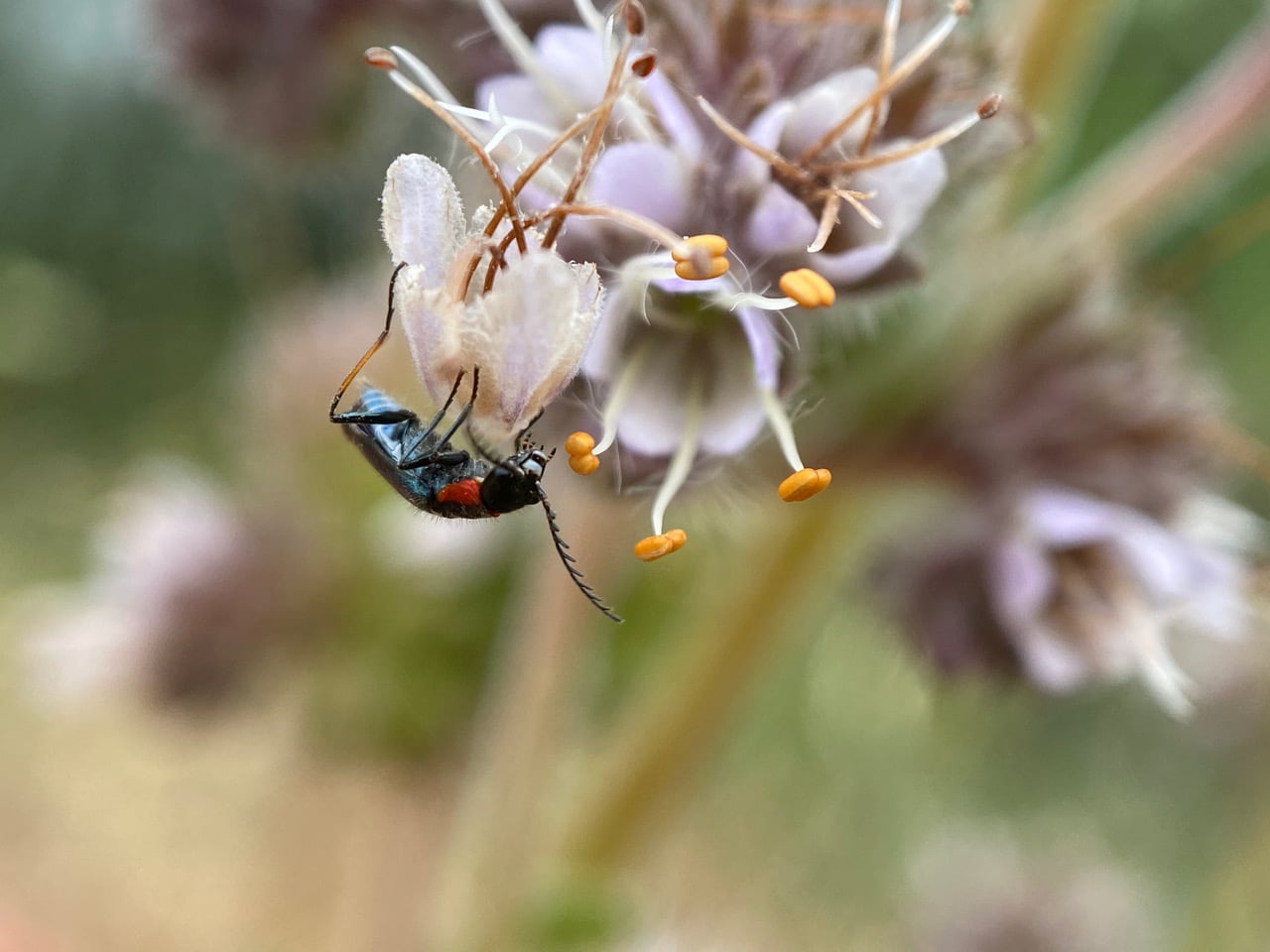 That’s a familiar silhouette of a Malachite Beetle, Malachius auritus (family Melyridae, subfamily Malachiinae) exploring an inflorescence of California Phacelia, Phacelia californica.