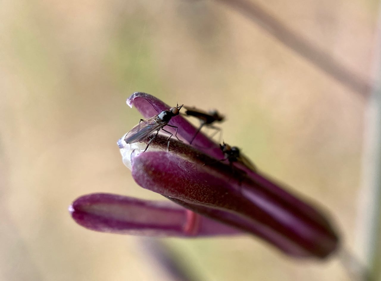 10:30 am. A few Dance Flies (family Empididae) are wandering on a spent flower of Soap Plant, Chlorogalum pomeridianum that is about to close up. These flowers open for only one night. Have the flies been bingeing on nectar through the night? Are they a nocturnal species?