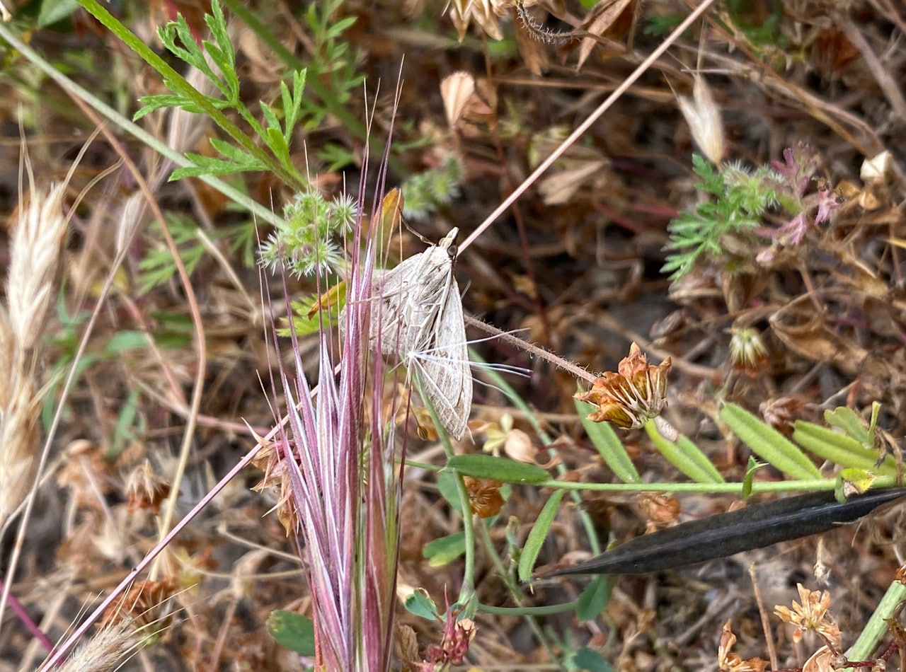 A moth flies past me and lands on a grass seed head in the undergrowth. I can only see its underside, and will probably never know its identity.