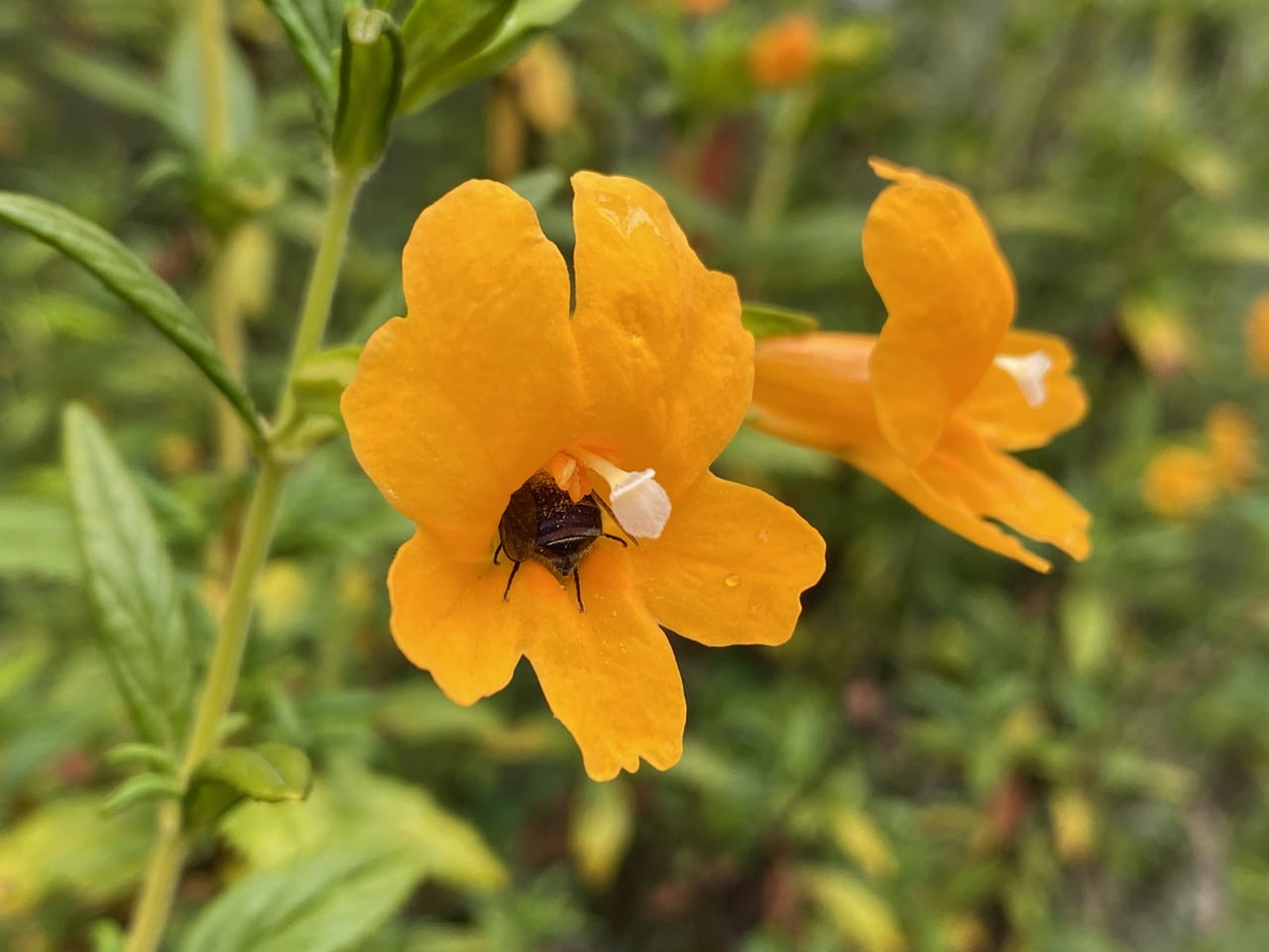 A Small-headed Fly, Eulonchus sp. (family Acroceridae) is cozily tucked within the corolla of a Sticky Monkeyflower, Diplacus aurantiacus. It’s a perfect fit – the flower and the fly seem to be made for each other.