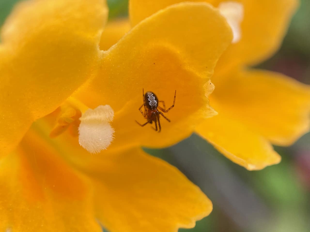 A tiny Tangle-web Spider (family Theridiidae) appears to be suspended in mid air at the entrance of a Sticky Monkeyflower. It is actually perched on an invisible tangled web that it has constructed to intercept insects that visit the flower. What a great spot for laying a trap!