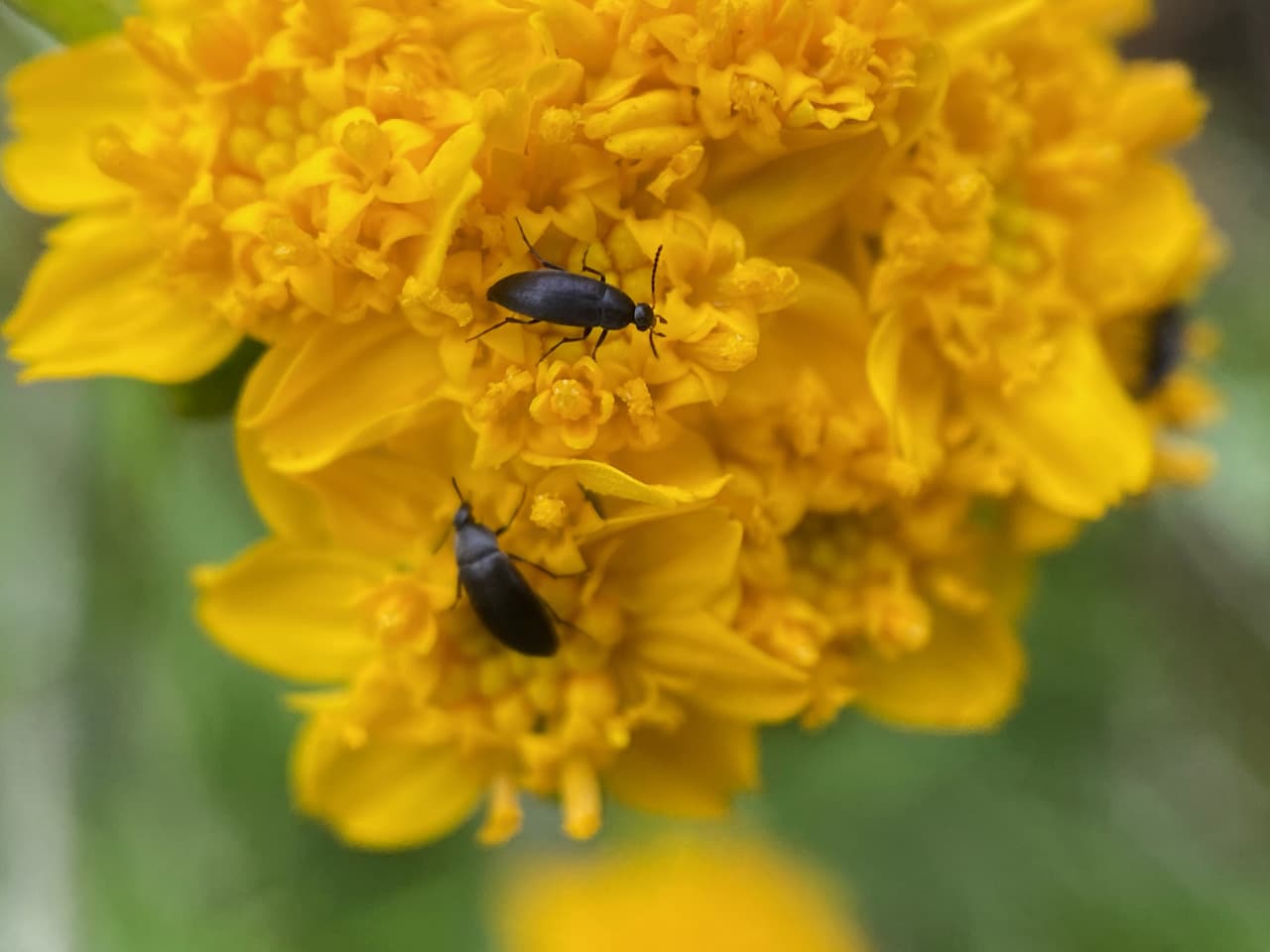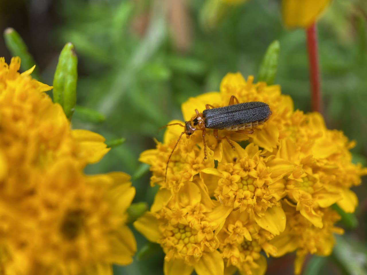 A Soldier Beetle, Cultellunguis americanus (family Cantharidae) is resting on an adjacent inflorescence of Golden Yarrow.
