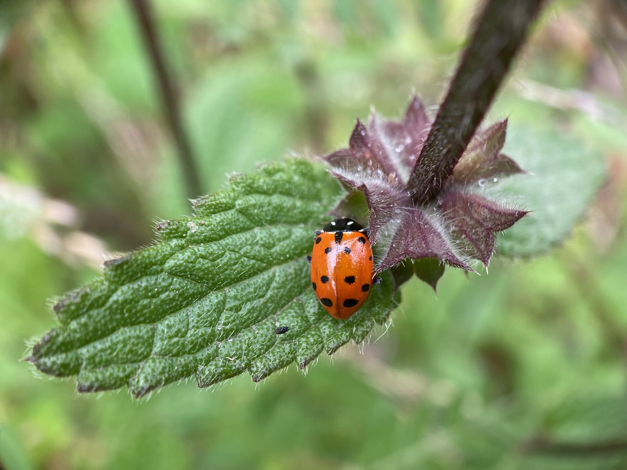 A Convergent Ladybeetle is hunkered down on a leaf of Wood Mint, Stachys ajugoides next to a whorl of funnel-shaped calyces from which old flowers have fallen.
