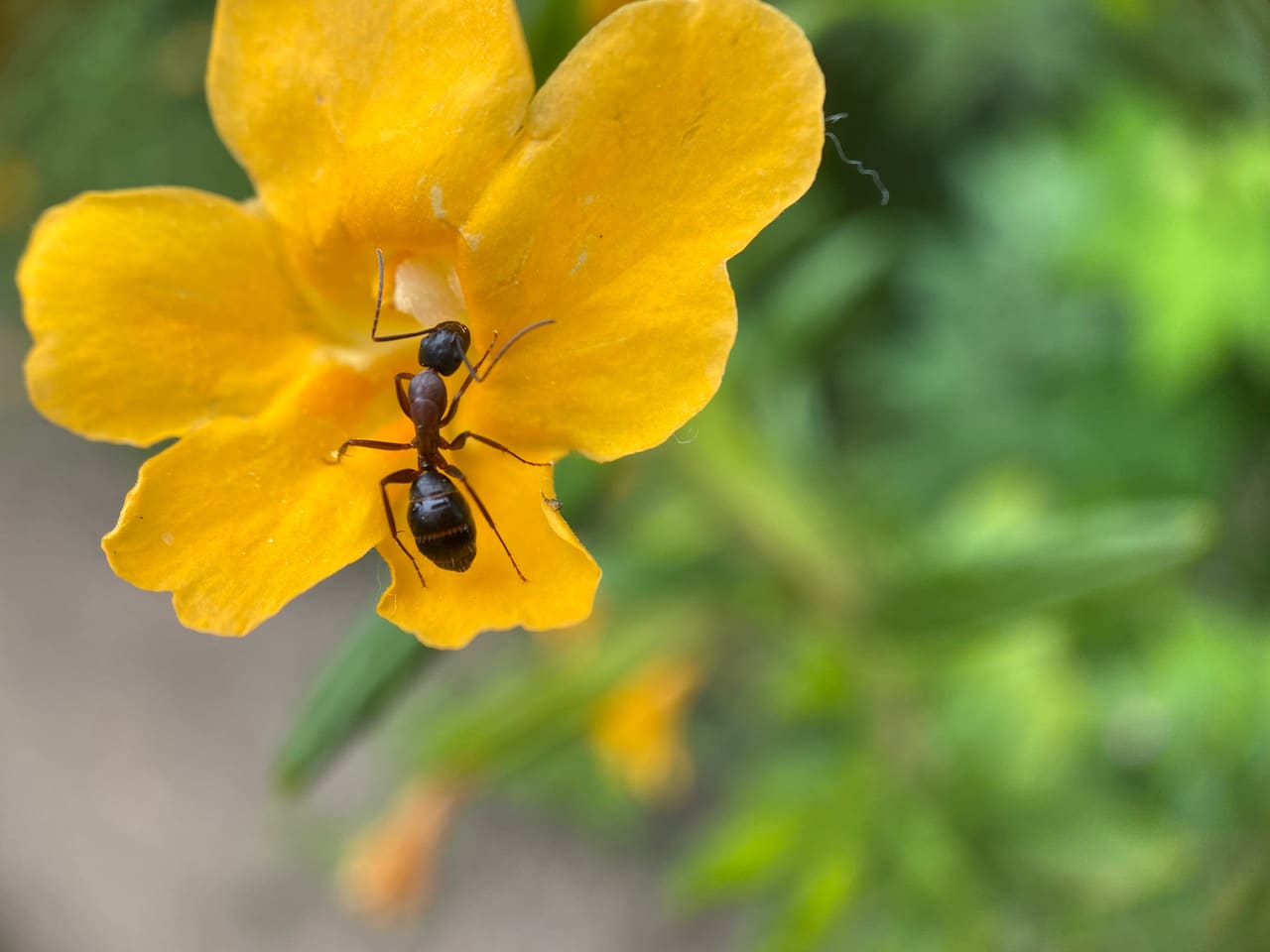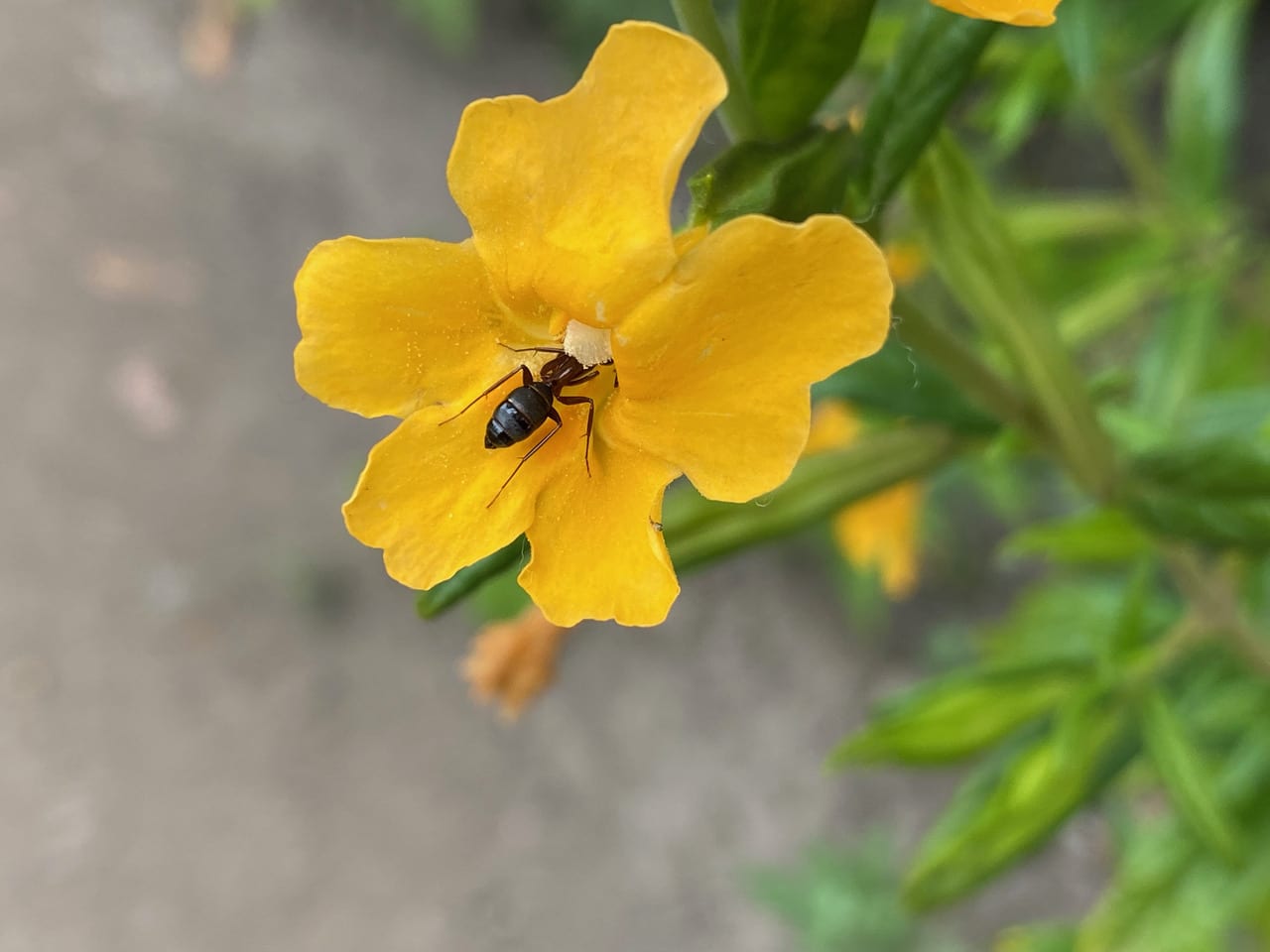 A large ant is entering a Sticky Monkeyflower.