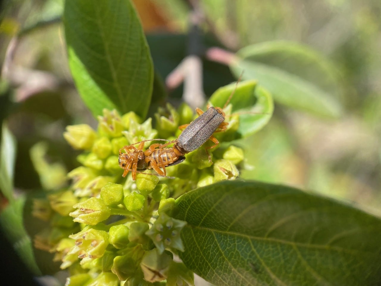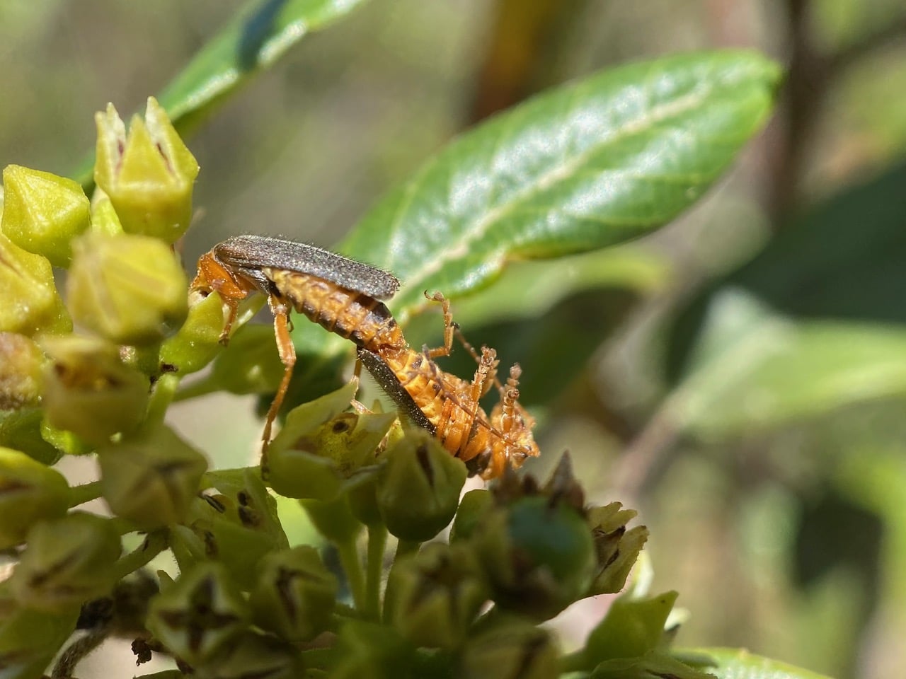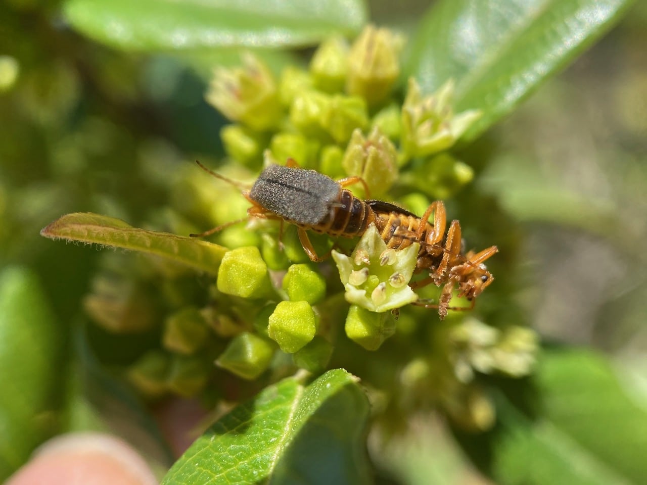 A Soldier Beetle sticks its head into a Coffeeberry flower to feed.