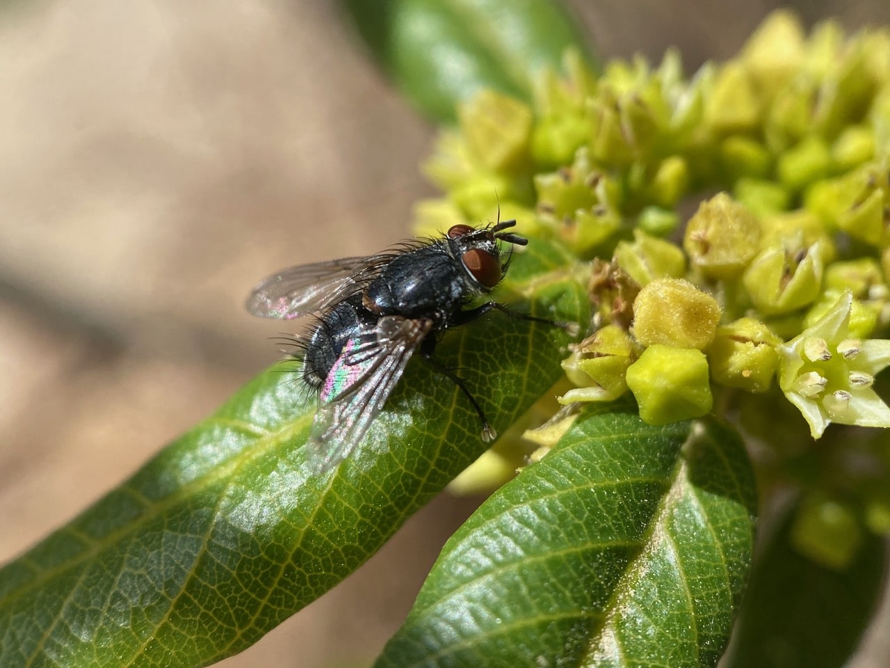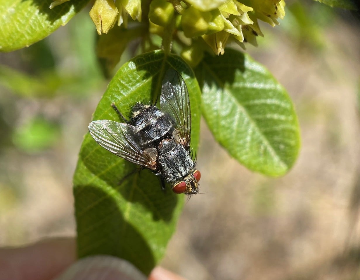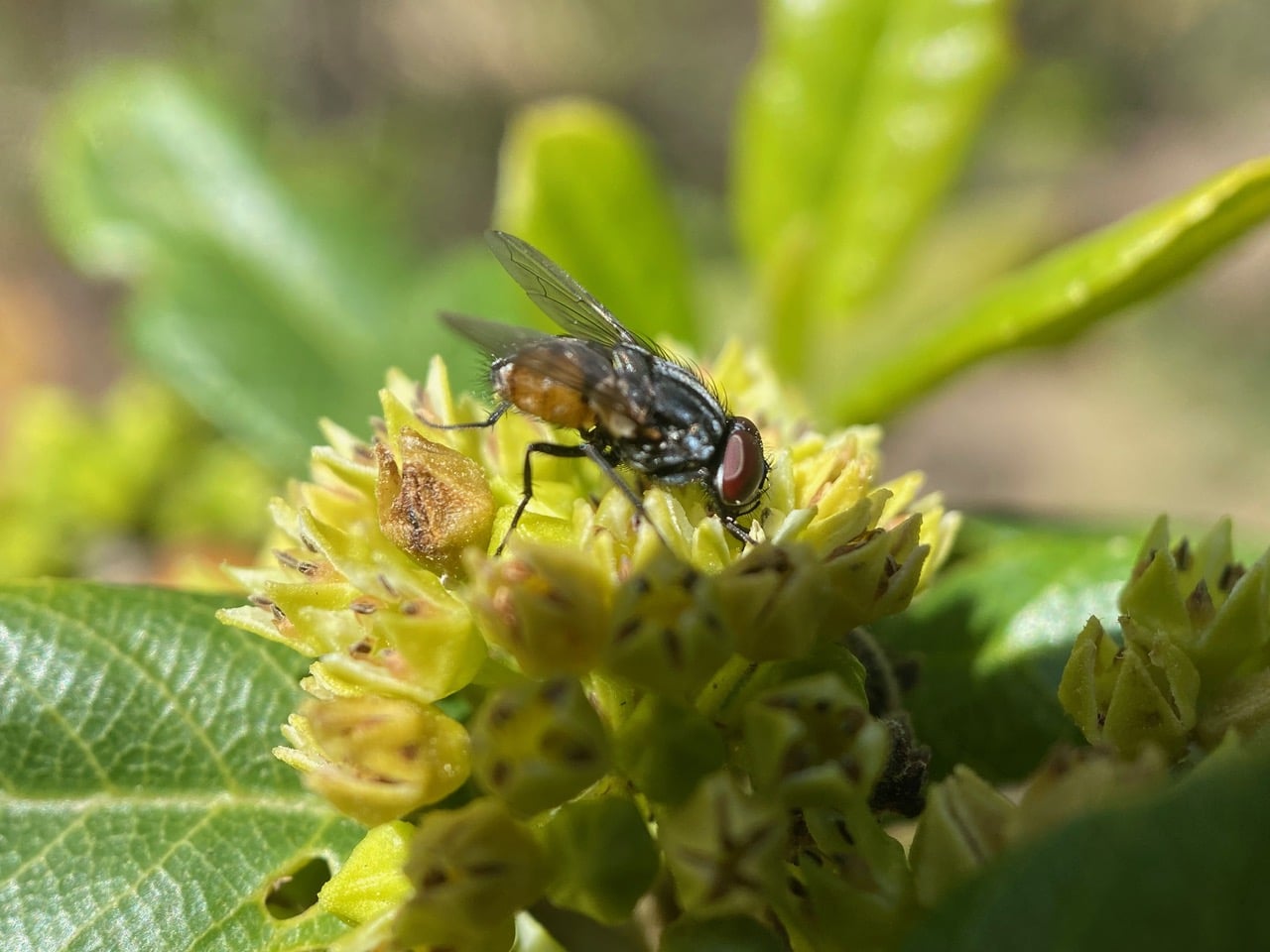 A Face Fly is foraging on a cluster of Coffeeberry flowers.
