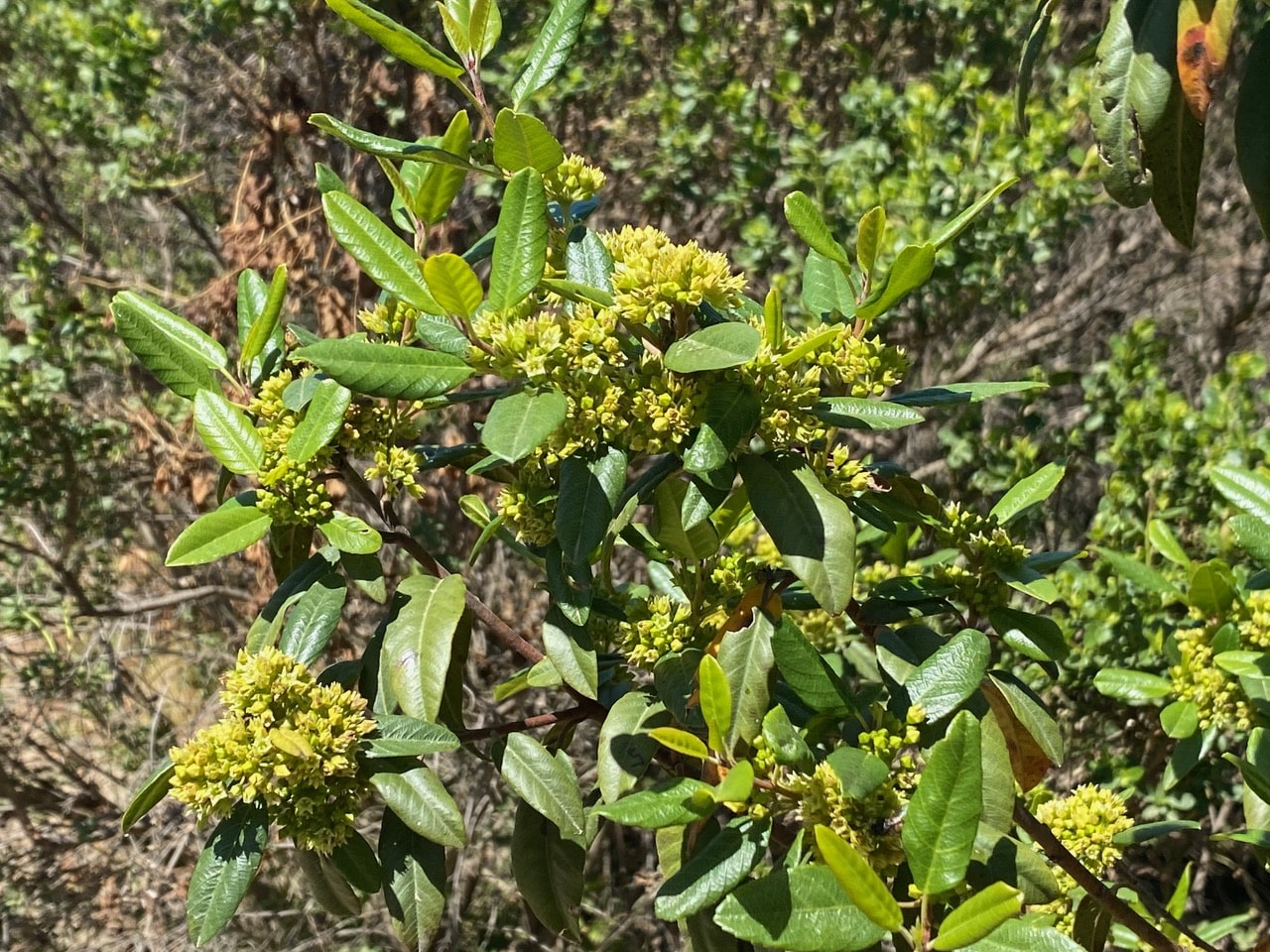 I am elated to finally come across a native plant is bloom. This small shrub of Coffeeberry, Frangula californica by the trail is full of tight clusters of small yellow-green flowers.