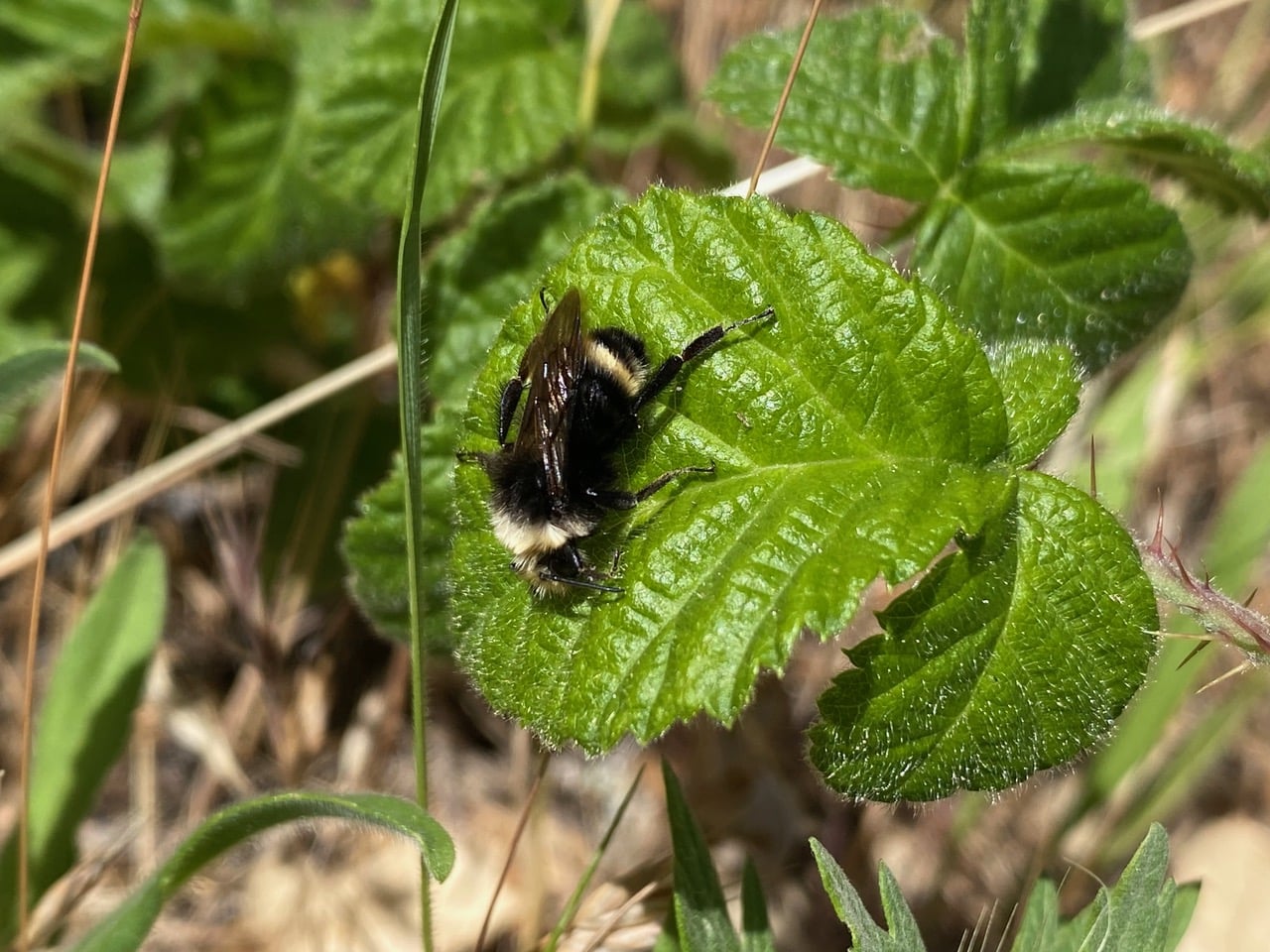 A large Yellow-faced Bumble Bee, Bombus vosnesenskii (family Apidae) is lying limp on a Blackberry leaf in the sun. As I stop to photograph it, the bee stirs and flies away. Was it just taking a break? I have been seeing this behavior a lot lately.
