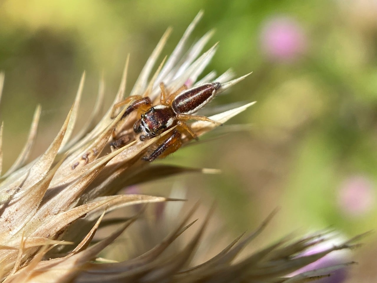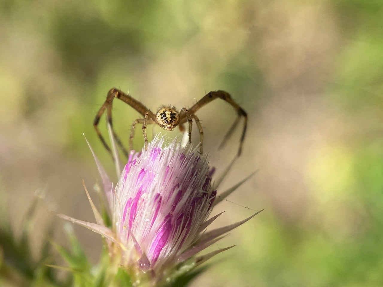 A small spider is resting on a sharp phyllary of an Italian Thistle.