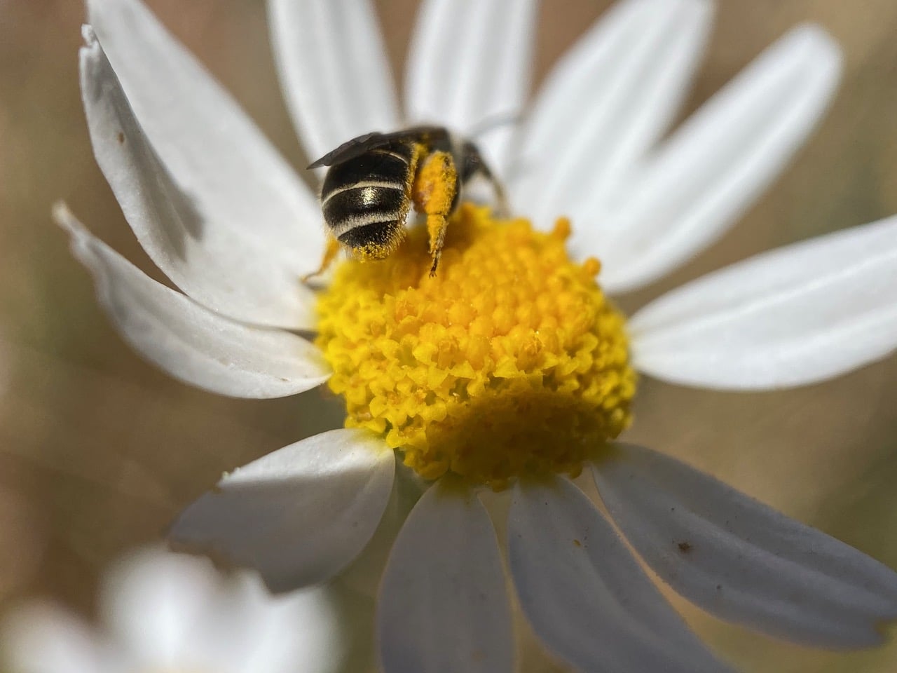 A Sweat Bee, Halictus sp. (family Halictidae) is actively collecting pollen from the English Daisy flowers.